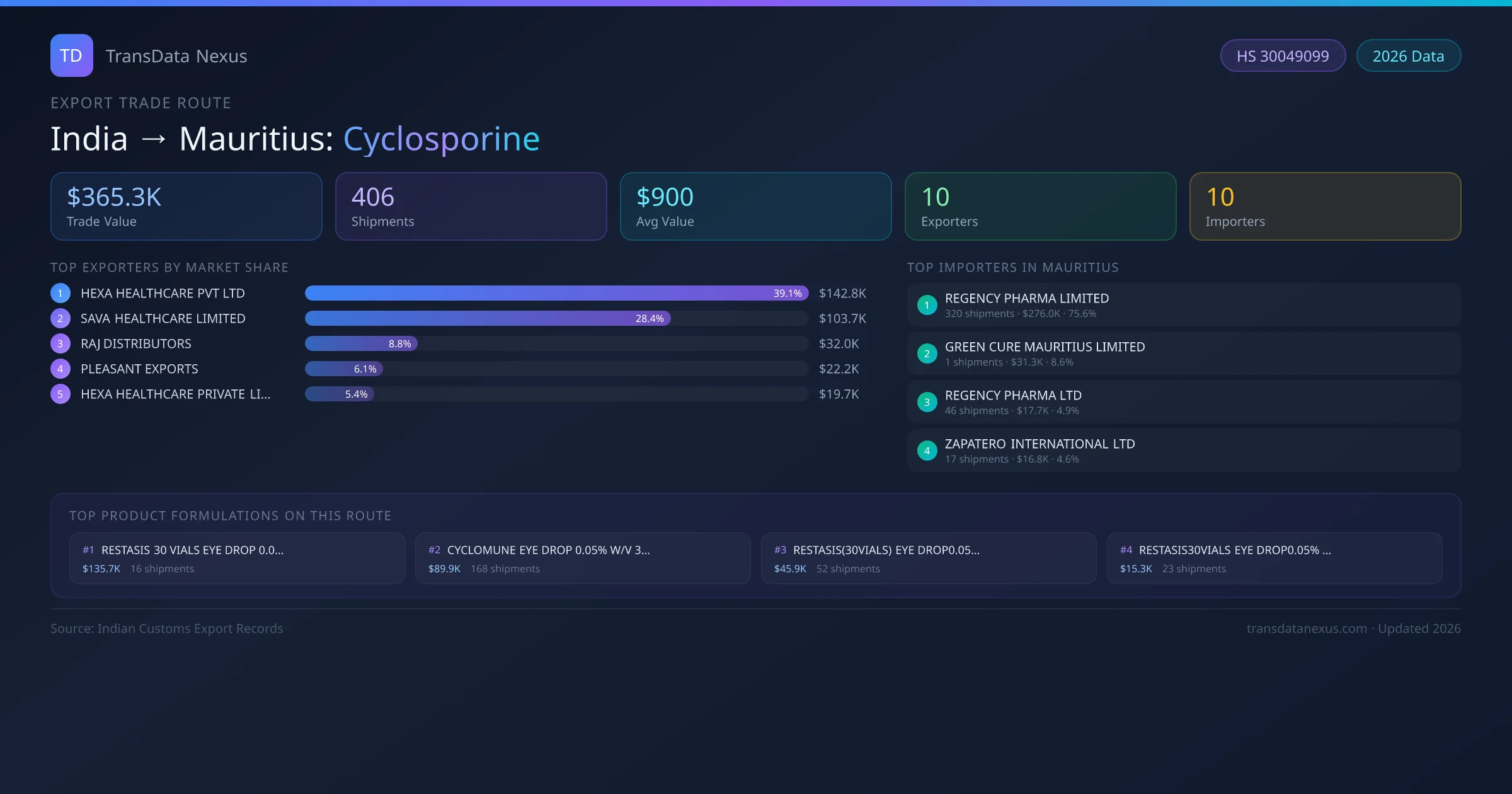 The India to Mauritius Cyclosporine corridor is one of India's established pharmaceutical export routes, with 406 shipments documented worth a combined $365.3K USD. The route is dominated by HEXA HEALTHCARE PVT LTD, which alone accounts for roughly 39% of all export value, reflecting the consolidated nature of India's cyclosporine manufacturing sector.