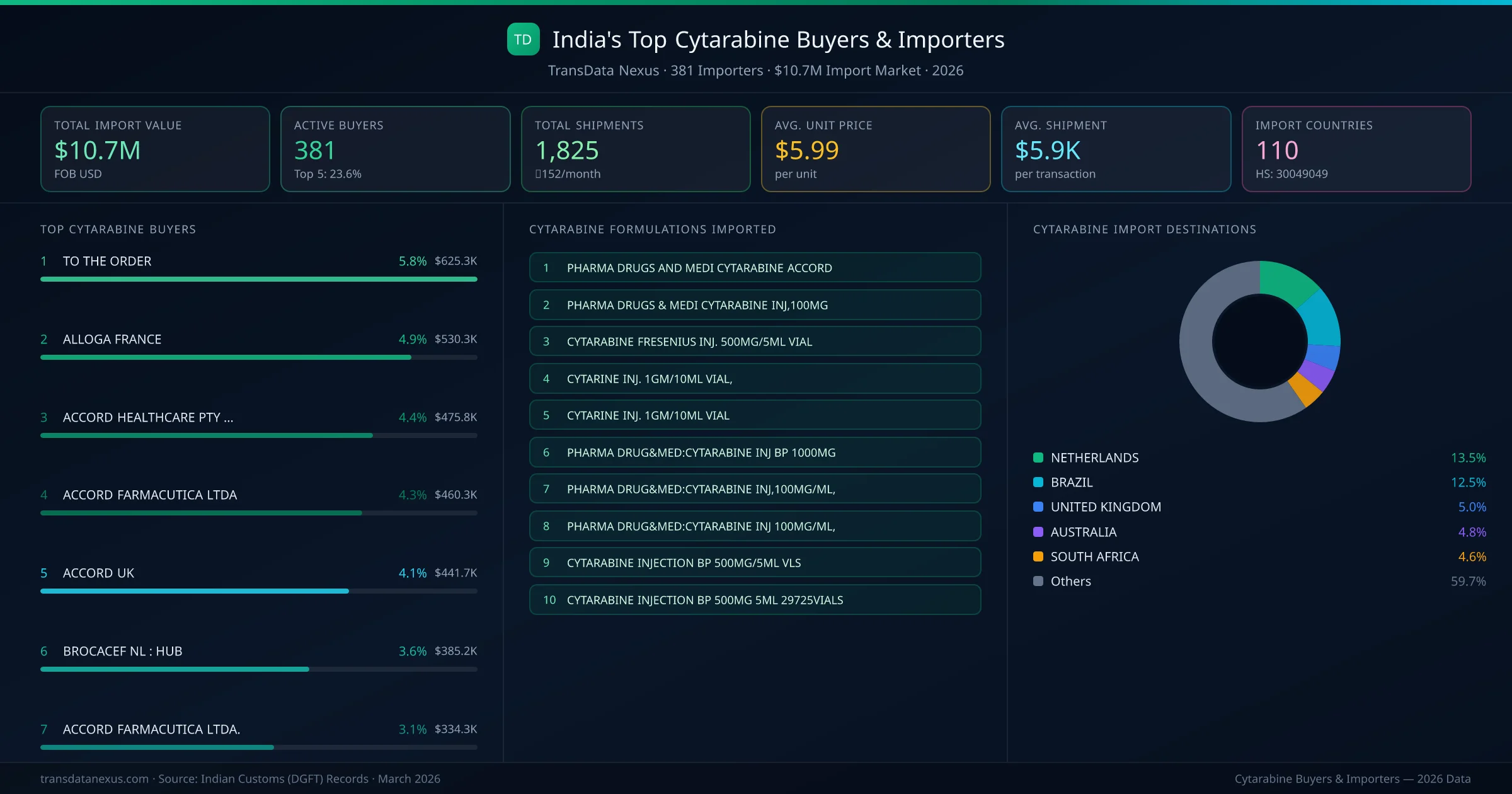 ALLOGA FRANCE (NETHERLANDS) is the leading cytarabine importer from India, holding a 4.9% share of the $10.7M market across 1,825 shipments from 381 buyers. The top 5 buyers โ ALLOGA FRANCE (NETHERLANDS), ACCORD FARMACUTICA LTDA (BRAZIL), ACCORD UK (UNITED KINGDOM), BROCACEF NL : HUB (NETHERLANDS), ACCORD FARMACUTICA LTDA. (BRAZIL) โ collectively control 20.0% of total import value.