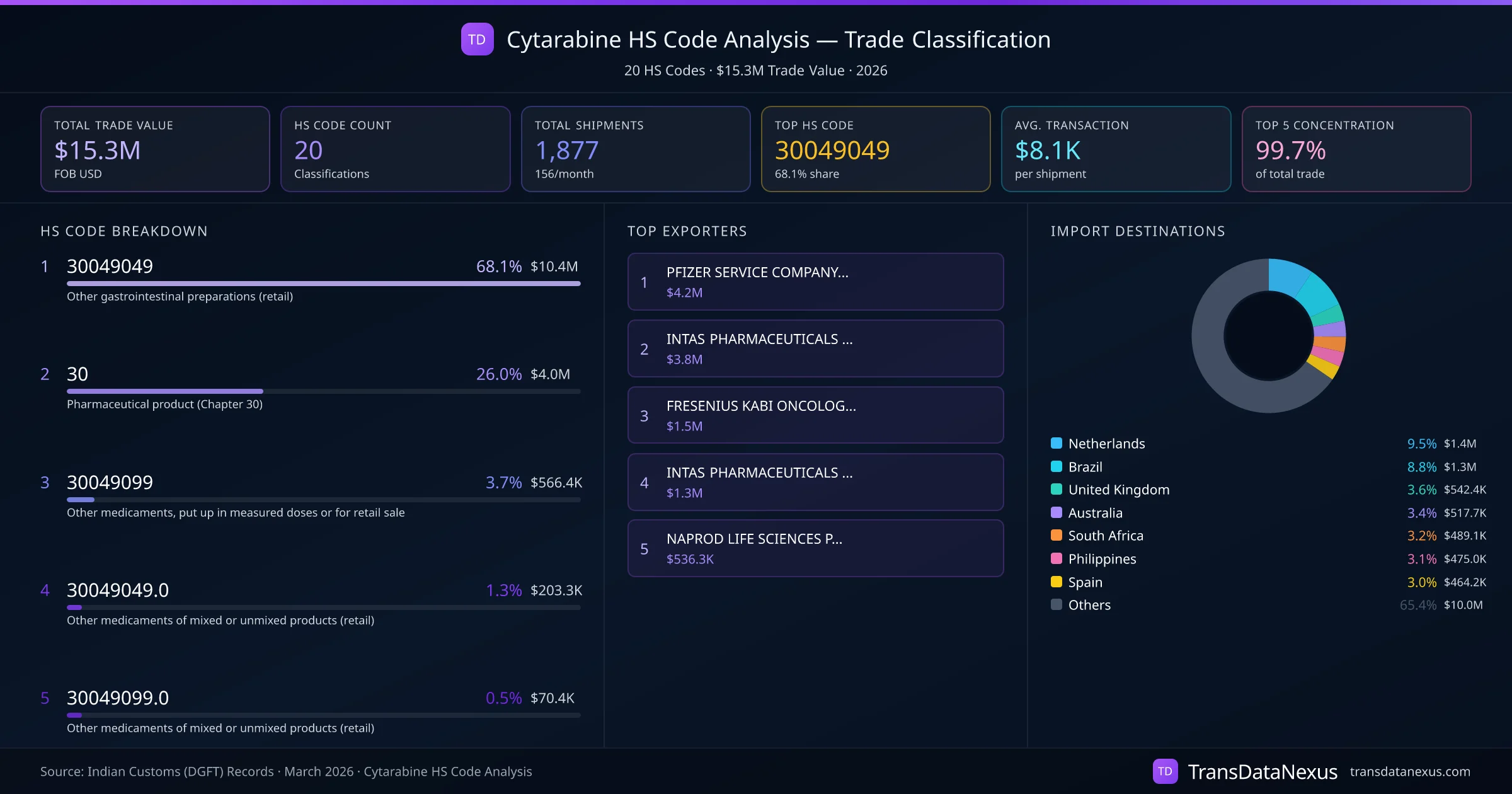 India exports Cytarabine under 20 distinct HS code classifications, representing a total trade value of $15.3M across 1,877 shipments. The dominant classification is HS 30049049 (Other gastrointestinal preparations (retail)), accounting for 68.1% of all Cytarabine trade at $10.4M. HS 30 (Pharmaceutical product (Chapter 30)) follows at 26.0% ($4.0M). The top 5 HS codes together account for 99.7% of total Cytarabine trade from India. The average transaction value is $8128. Key importing markets include Netherlands, Brazil, United Kingdom. Leading exporters include PFIZER SERVICE COMPANY BV and INTAS PHARMACEUTICALS LIMITED. Data sourced from Indian Customs (DGFT) shipping bill records.