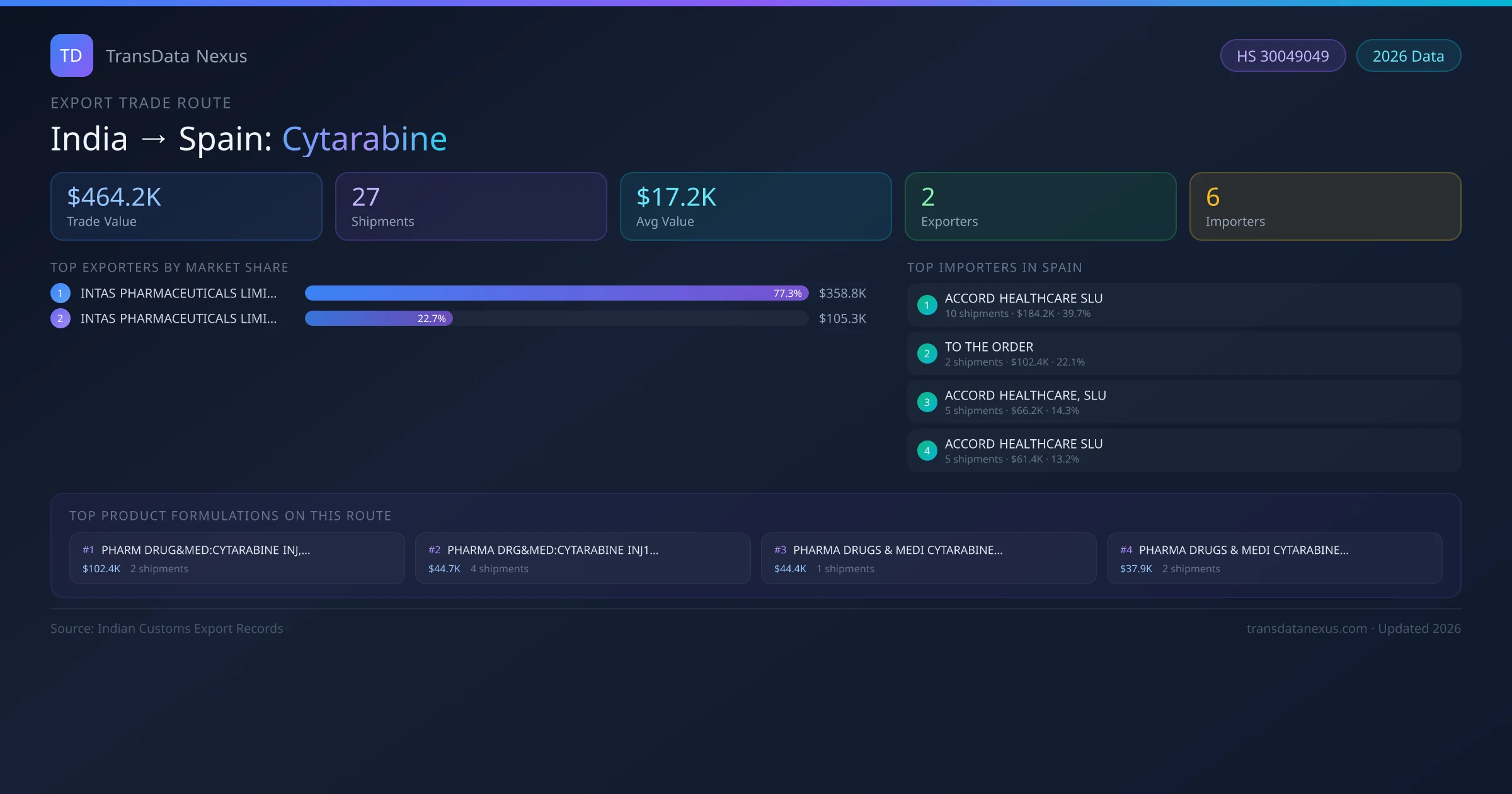 The leading Indian exporters of Cytarabine to Spain are INTAS PHARMACEUTICALS LIMITED, INTAS PHARMACEUTICALS LIMITED . INTAS PHARMACEUTICALS LIMITED holds the largest market share at approximately 77% of total trade value on this route.