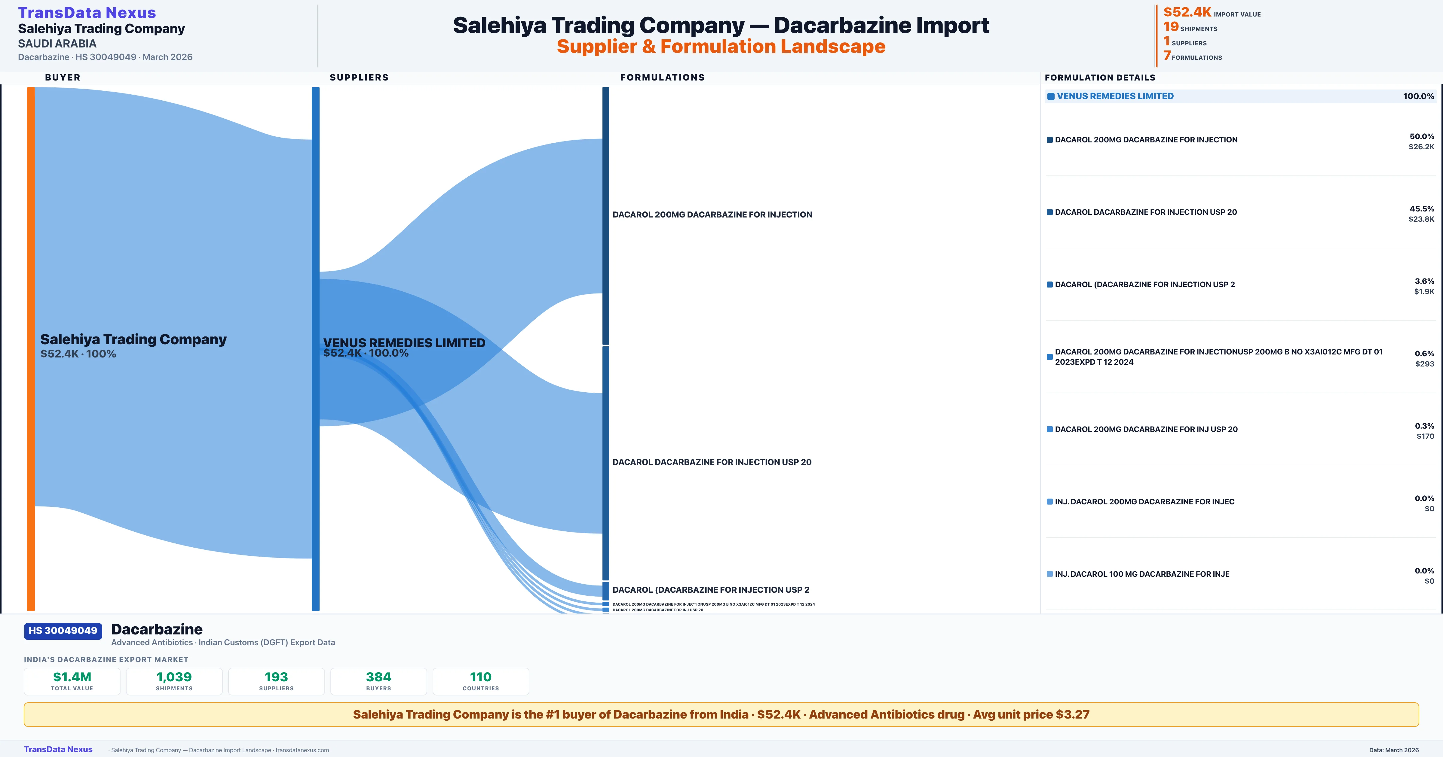 SALEHIYA TRADING COMPANY sources Dacarbazine from 1 verified Indian supplier based on 19 customs records. The primary supplier is VENUS REMEDIES LIMITED accounting for 100.0% of imports.