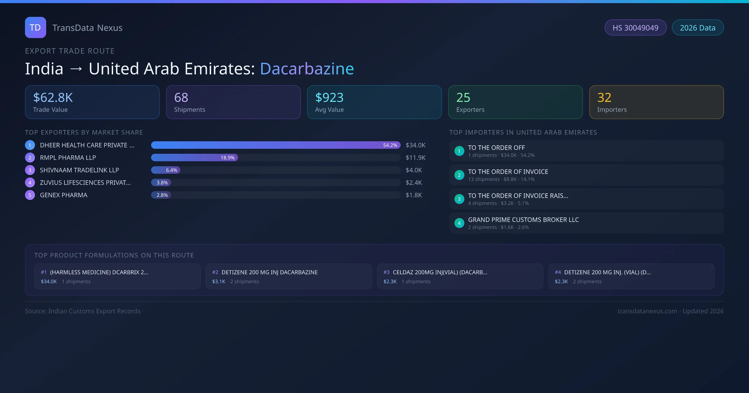 - 1.Route Identification: India to United Arab Emirates export trade corridor identified from Indian Customs (DGFT) records for Dacarbazine.