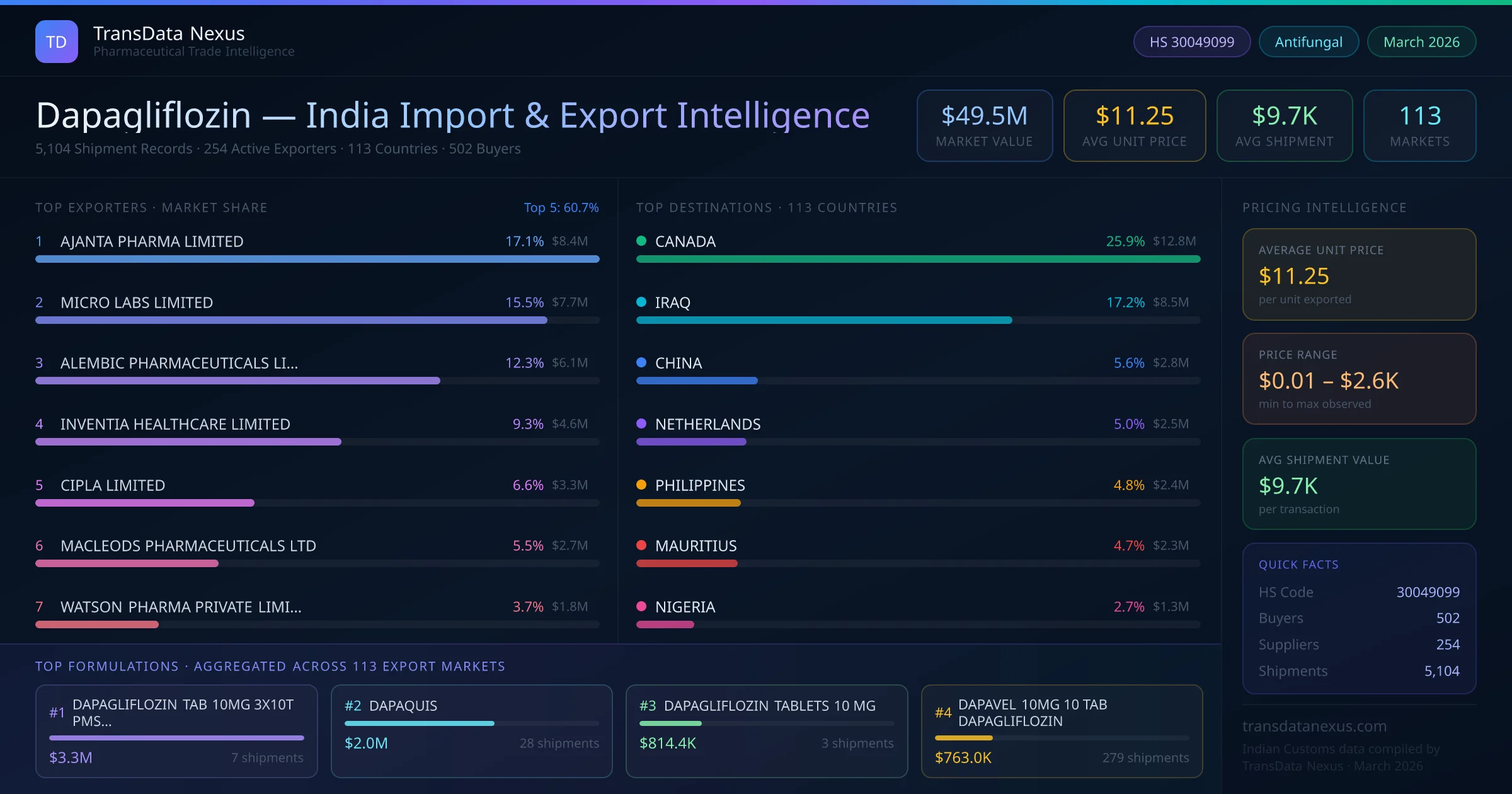 Between 2022 and 2026, India exported $49.5M worth of dapagliflozin across 5,104 verified shipments to 113 countries — covering 58% of world markets in the Advanced Diabetes Medications segment. The largest destination is CANADA (25.9%). AJANTA PHARMA LIMITED leads with a 17.1% share. All figures are drawn from Indian Customs (DGFT) shipping bill records spanning four years of trade activity.