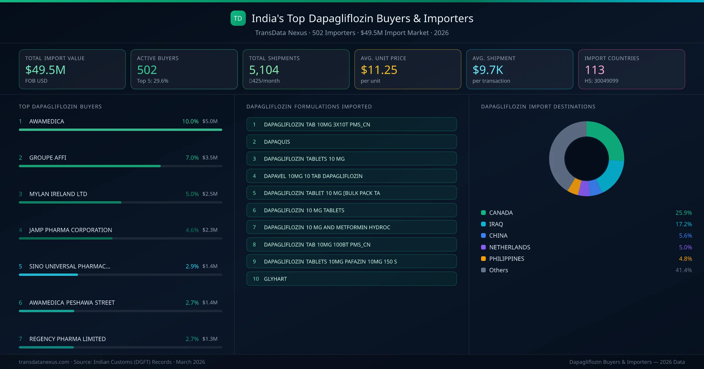 AWAMEDICA (IRAQ) is the leading dapagliflozin importer from India, holding a 10.0% share of the $49.5M market across 5,104 shipments from 502 buyers. The top 5 buyers — AWAMEDICA (IRAQ), GROUPE AFFI (CANADA), MYLAN IRELAND LTD (NETHERLANDS), JAMP PHARMA CORPORATION (CANADA), SINO UNIVERSAL PHARMACEUTICAL CO (CHINA) — collectively control 29.6% of total import value.