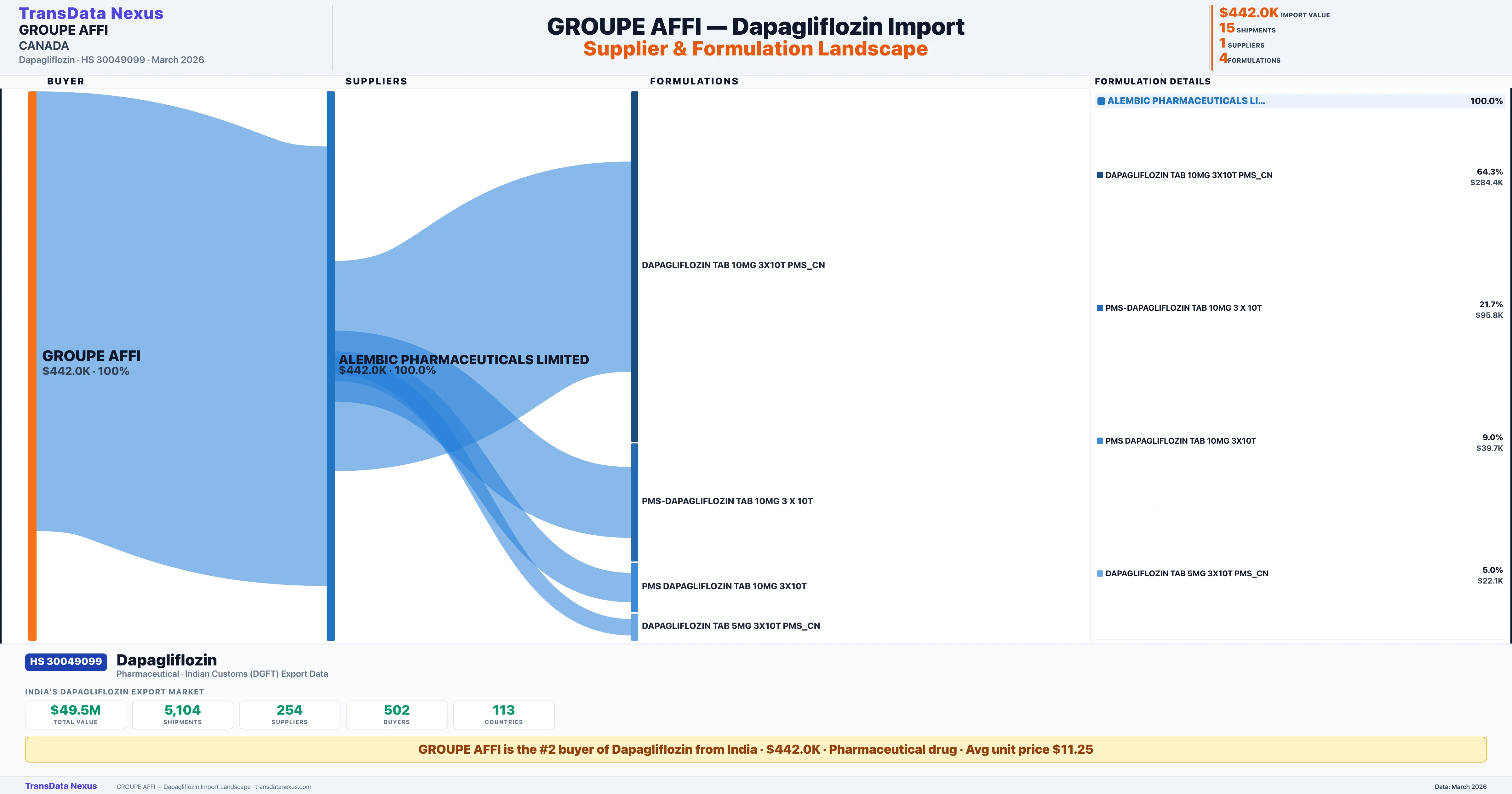 GROUPE AFFI sources Dapagliflozin from 1 verified Indian supplier: ALEMBIC PHARMACEUTICALS LIMITED ($442.0K, 100.0%). This is based on 15 customs records.