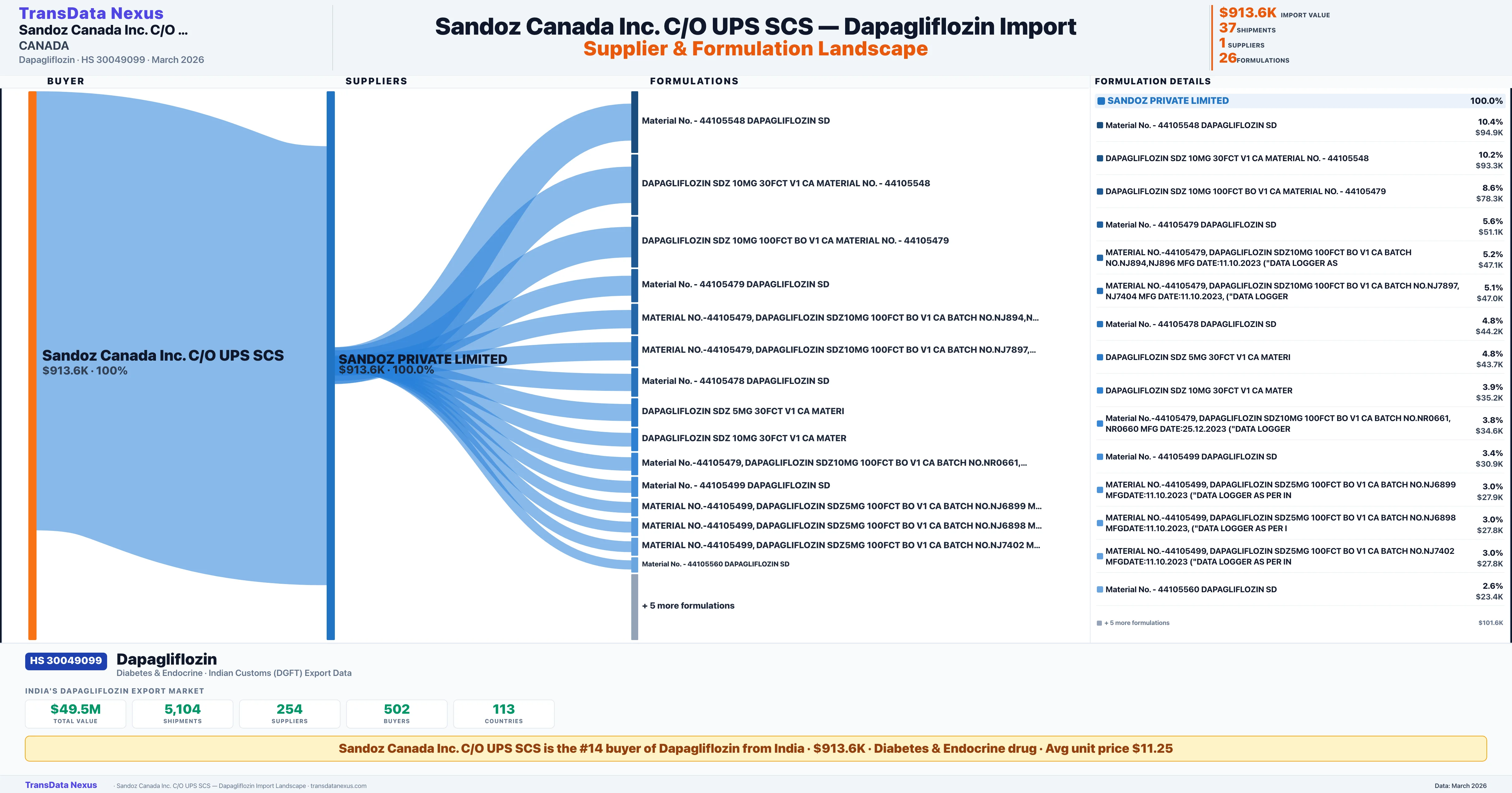SANDOZ CANADA INC. C/O UPS SCS sources Dapagliflozin from 1 verified Indian supplier: SANDOZ PRIVATE LIMITED ($913.6K, 100.0%). This is based on 37 customs records.