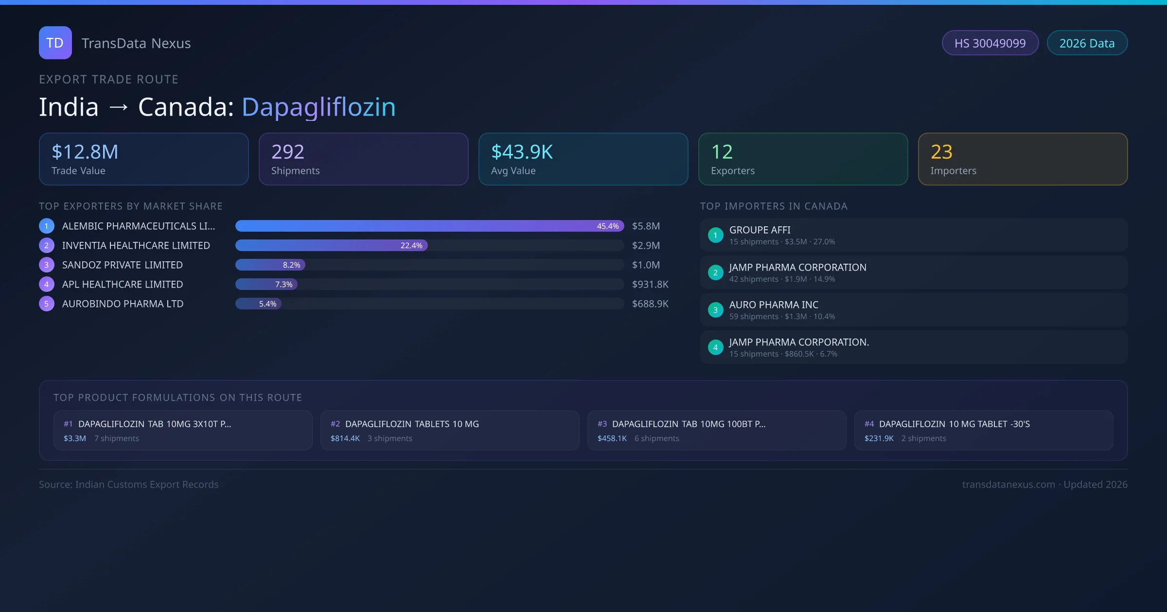 The India to Canada Dapagliflozin corridor is one of India's established pharmaceutical export routes, with 292 shipments documented worth a combined $12.8M USD. The route is dominated by ALEMBIC PHARMACEUTICALS LIMITED, which alone accounts for roughly 45% of all export value, reflecting the consolidated nature of India's dapagliflozin manufacturing sector.