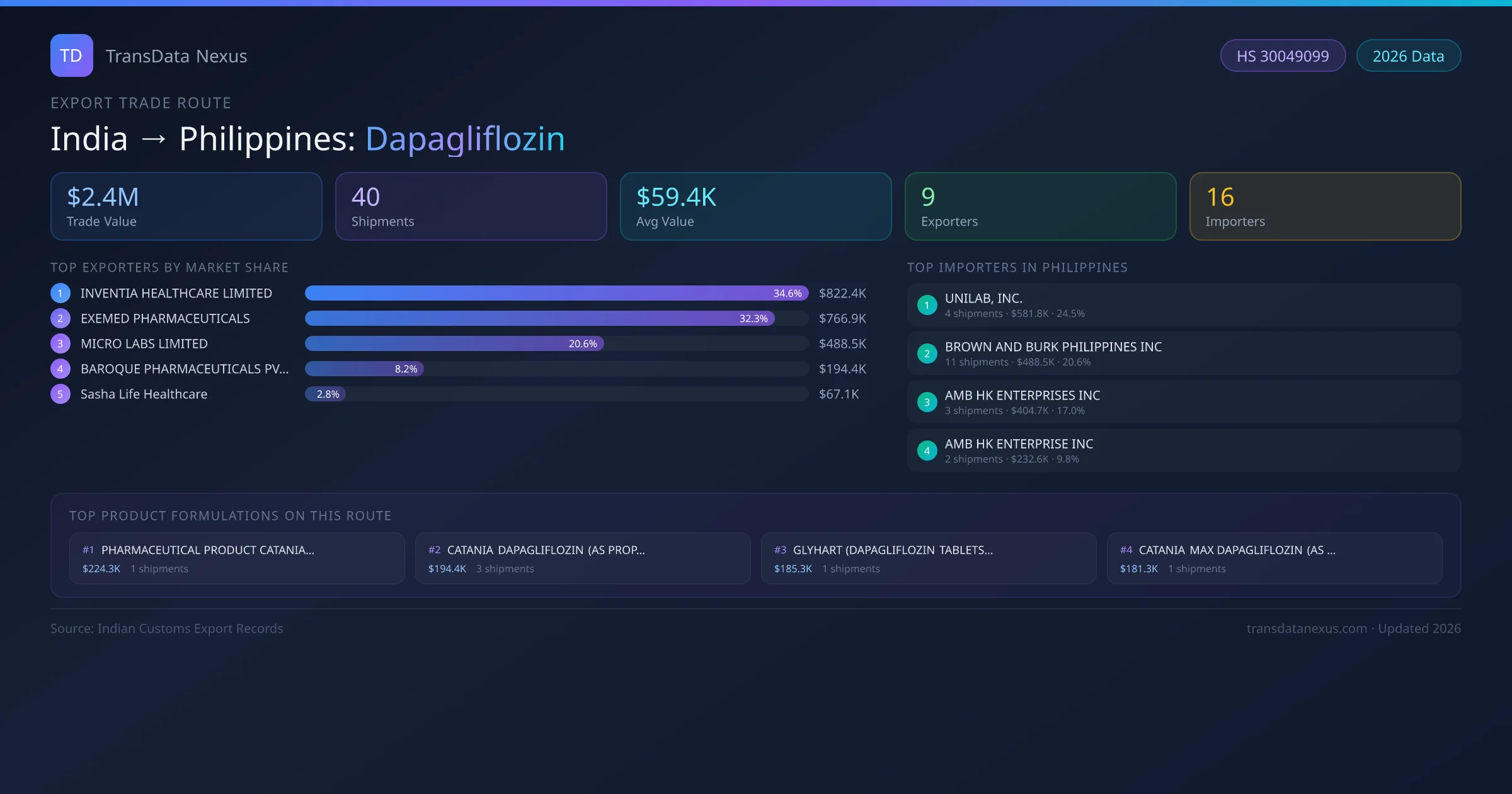India has recorded 40 verified shipments of Dapagliflozin exported to Philippines, representing a combined trade value of $2.4M USD. This corridor is served by 9 active Indian exporters, with an average shipment value of $59.4K USD. The leading Indian exporter is INVENTIA HEALTHCARE LIMITED, which accounts for 35% of total export value with 11 shipments worth $822.4K USD. On the buying side, UNILAB, INC. is the largest importer in Philippines with $581.8K USD in purchases. The top 3 suppliers — INVENTIA HEALTHCARE LIMITED, EXEMED PHARMACEUTICALS, MICRO LABS LIMITED — together control 87% of total trade value on this route. All data sourced from Indian Customs (DGFT) shipping bill records. Values reported in FOB USD.