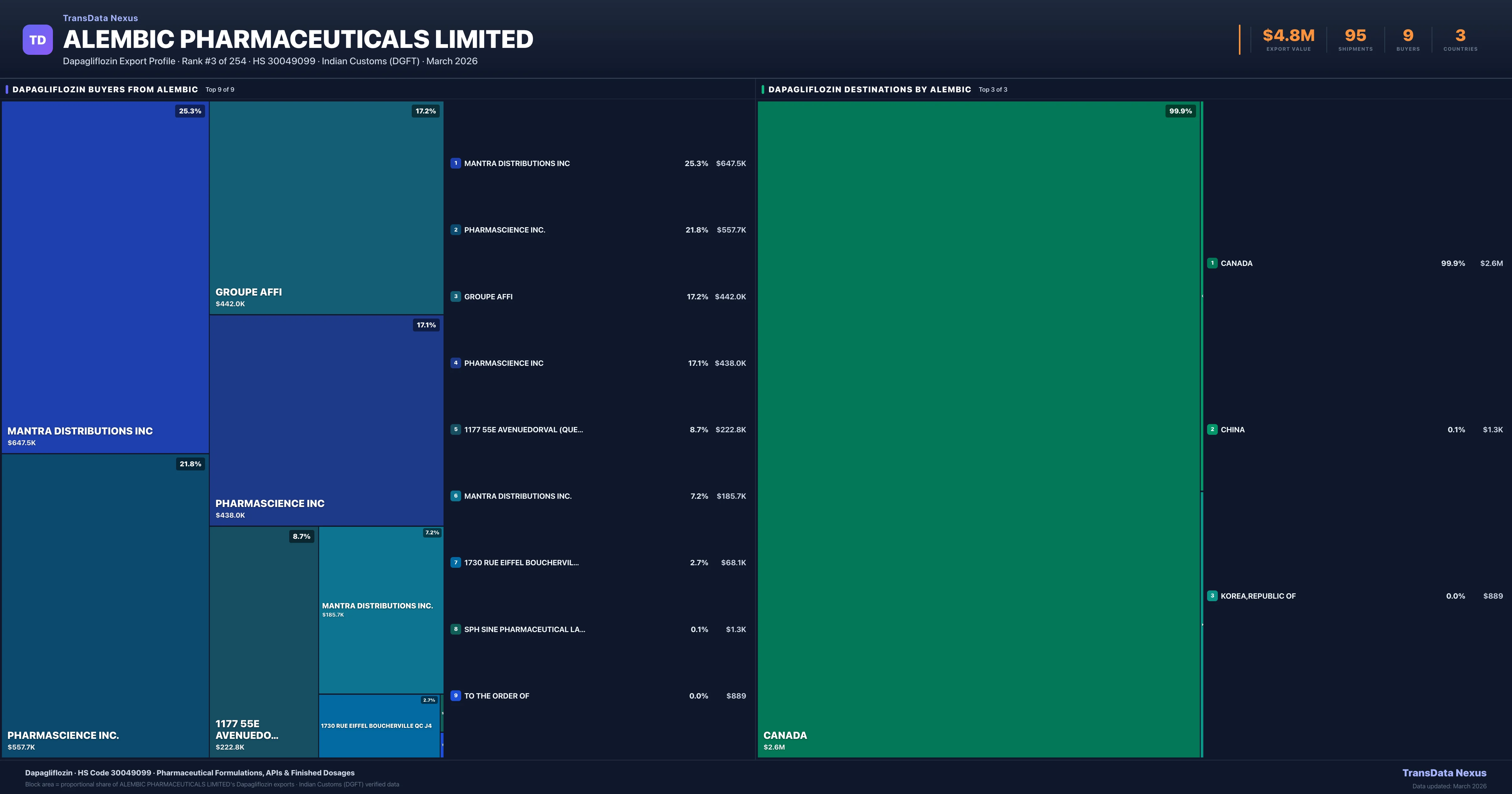 Alembic Pharmaceuticals Limited supplies Dapagliflozin to 9 buyers globally. The largest buyer is MANTRA DISTRIBUTIONS INC (CANADA), followed by PHARMASCIENCE INC. (CANADA) and GROUPE AFFI (CANADA). These buyers represent pharmaceutical distributors, hospital groups, and government procurement agencies in their respective markets.