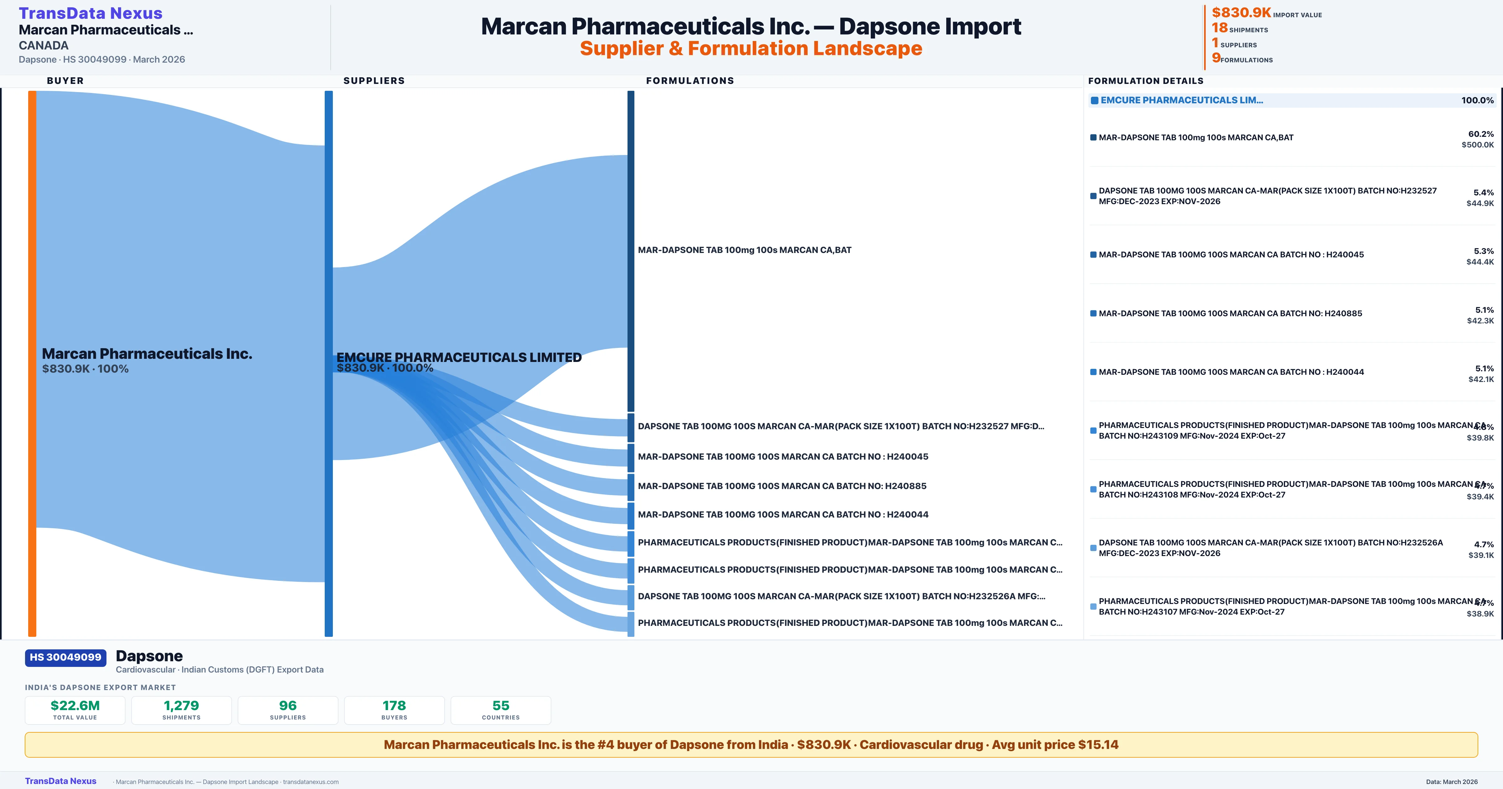 MARCAN PHARMACEUTICALS INC. sources Dapsone from 1 verified Indian supplier: EMCURE PHARMACEUTICALS LIMITED ($830.9K, 100.0%). This is based on 18 customs records.