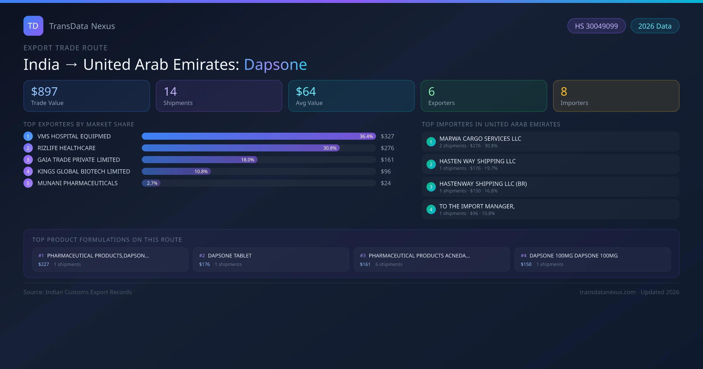 The India to United Arab Emirates Dapsone corridor is one of India's established pharmaceutical export routes, with 14 shipments documented worth a combined $897 USD. The route is dominated by VMS HOSPITAL EQUIPMED, which alone accounts for roughly 36% of all export value, reflecting the consolidated nature of India's dapsone manufacturing sector.