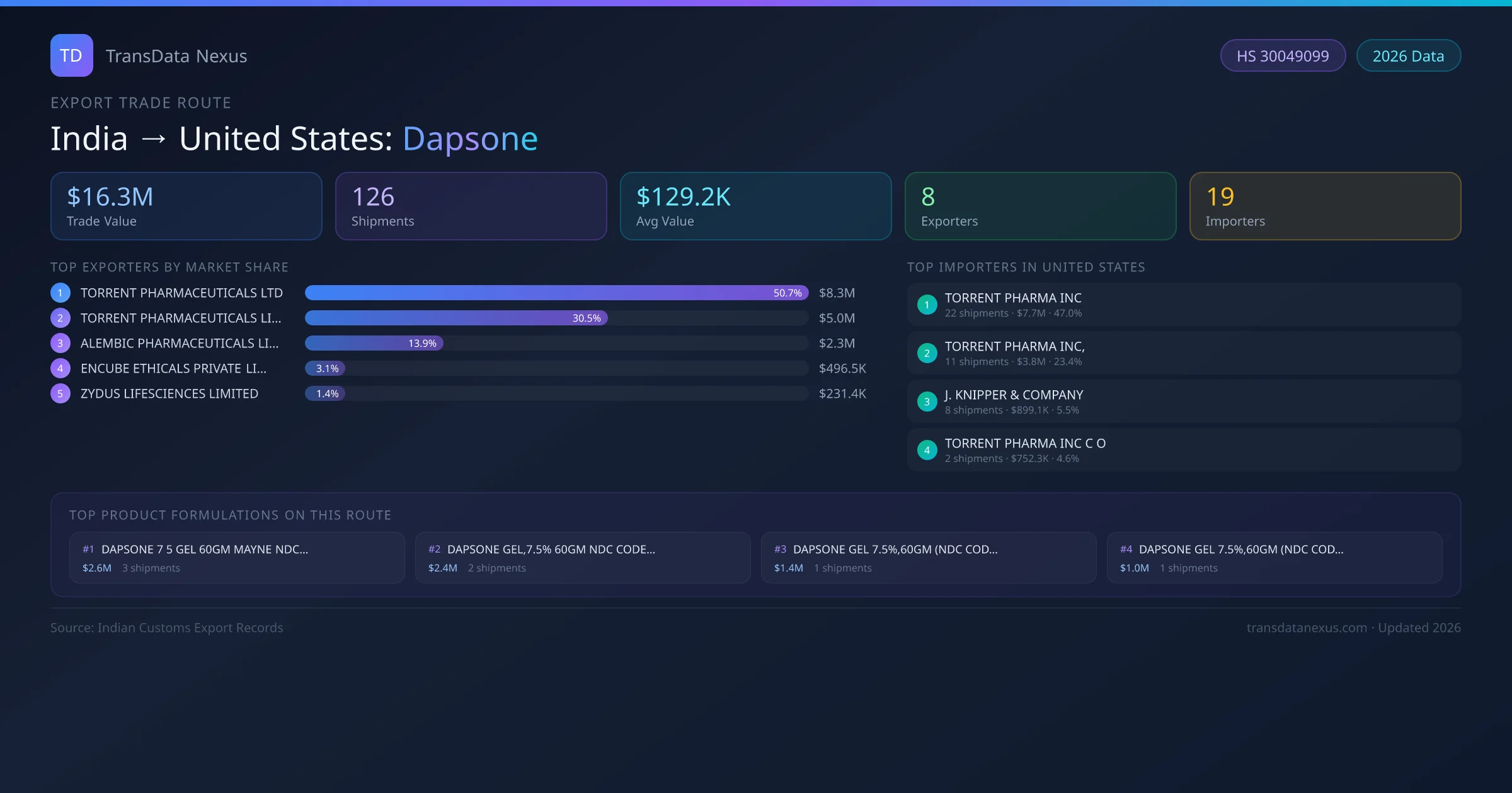 The India to United States Dapsone corridor is one of India's established pharmaceutical export routes, with 126 shipments documented worth a combined $16.3M USD. The route is dominated by TORRENT PHARMACEUTICALS LTD, which alone accounts for roughly 51% of all export value, reflecting the consolidated nature of India's dapsone manufacturing sector.