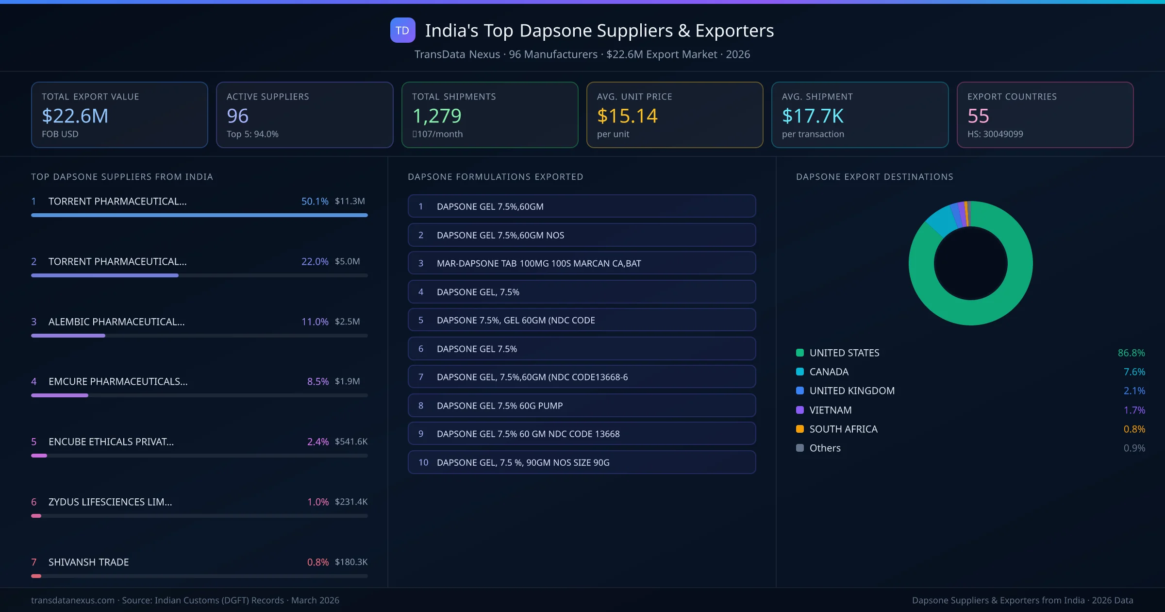TORRENT PHARMACEUTICALS LTD is the leading dapsone exporter from India, holding a 50.1% share of the $22.6M market across 1,279 shipments from 96 exporters. The top 5 suppliers โ TORRENT PHARMACEUTICALS LTD, TORRENT PHARMACEUTICALS LIMITED, ALEMBIC PHARMACEUTICALS LIMITED, EMCURE PHARMACEUTICALS LIMITED, ENCUBE ETHICALS PRIVATE LIMITED โ collectively control 94.0% of total export value, indicating a highly concentrated market. Individual shares are: TORRENT PHARMACEUTICALS LTD (50.1%), TORRENT PHARMACEUTICALS LIMITED (22.0%), ALEMBIC PHARMACEUTICALS LIMITED (11.0%), EMCURE PHARMACEUTICALS LIMITED (8.5%), ENCUBE ETHICALS PRIVATE LIMITED (2.4%).
