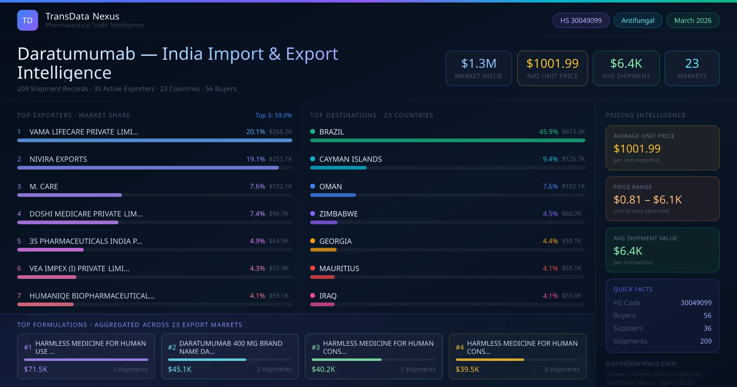 The average unit price for daratumumab exports from India is $1001.99 per unit, with prices ranging from $0.81 to $6136.46 depending on formulation and order volume.