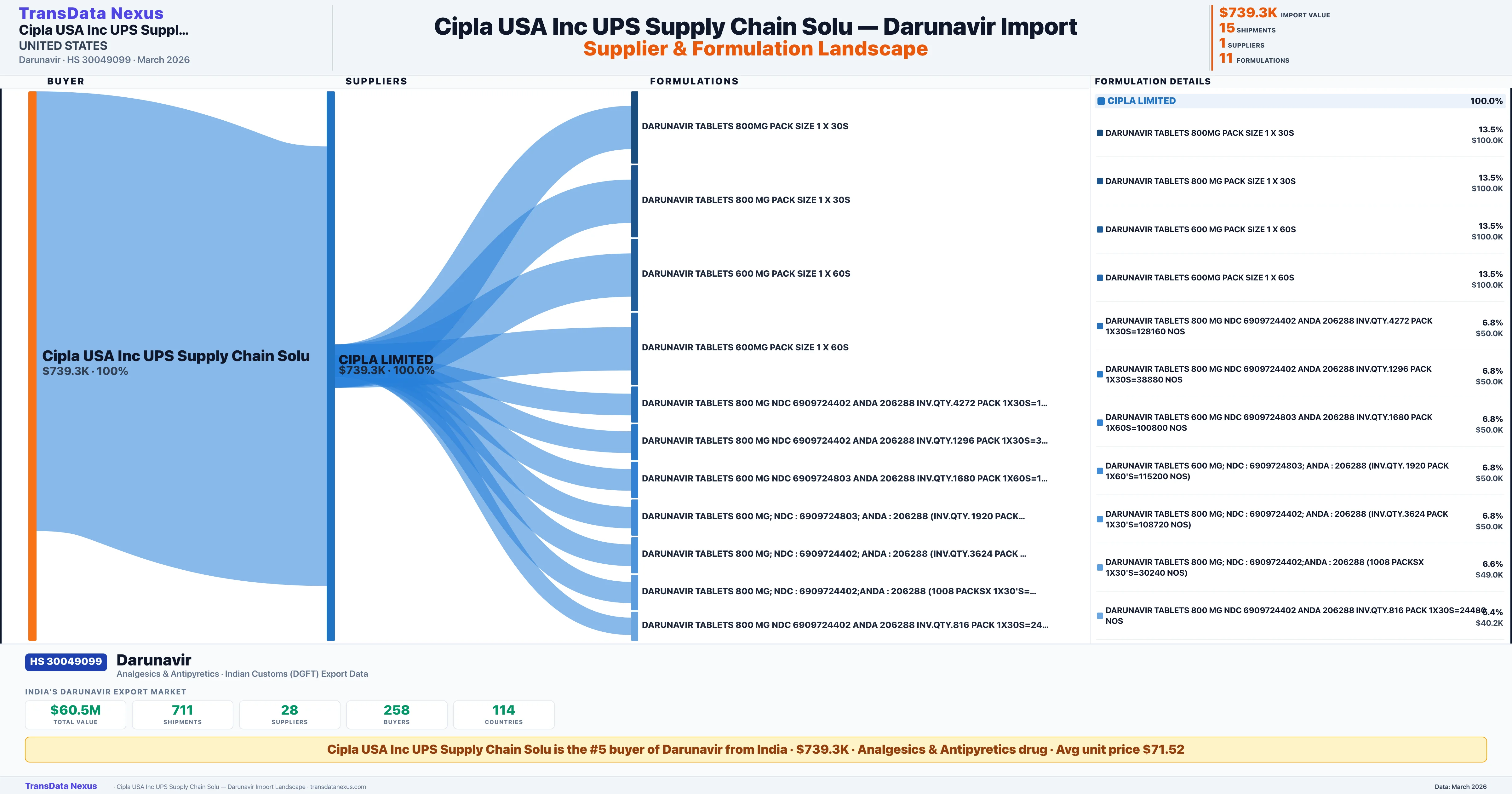 CIPLA USA INC UPS SUPPLY CHAIN SOLU sources Darunavir from 1 verified Indian supplier: CIPLA LIMITED ($739.3K, 100.0%). This is based on 15 customs records.