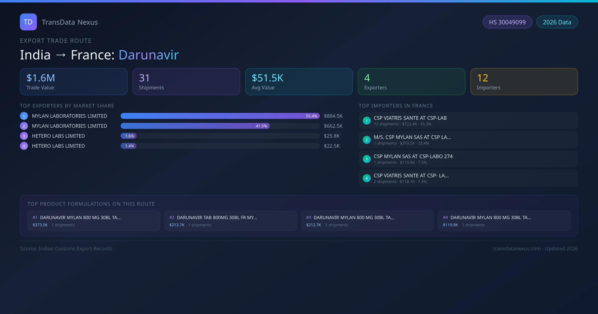 - 1.Route Identification: India to France export trade corridor identified from Indian Customs (DGFT) records for Darunavir.