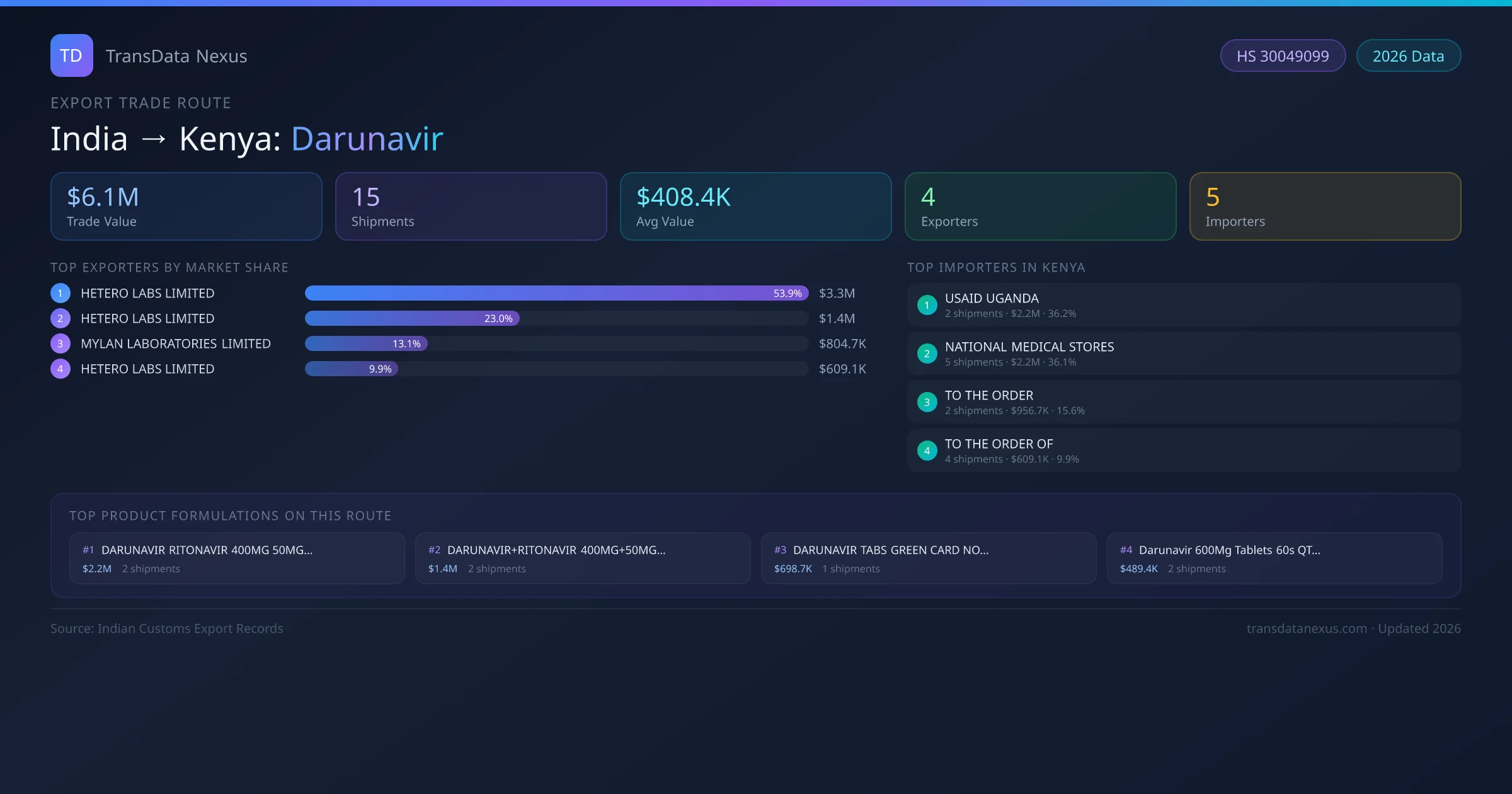 - 1.Route Identification: India to Kenya export trade corridor identified from Indian Customs (DGFT) records for Darunavir.
