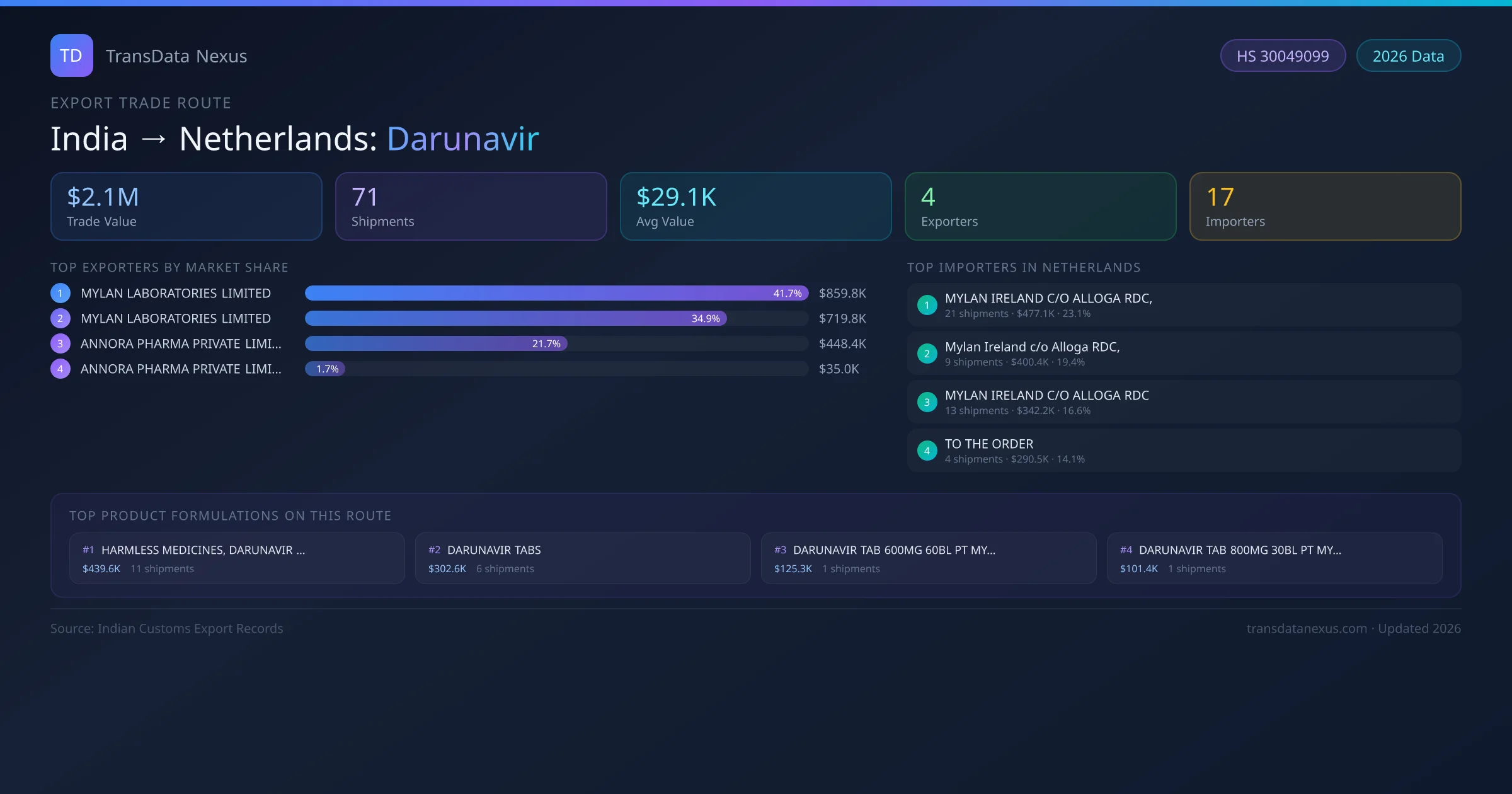 India has recorded 71 verified shipments of Darunavir exported to Netherlands, representing a combined trade value of $2.1M USD. This corridor is served by 4 active Indian exporters, with an average shipment value of $29.1K USD. The leading Indian exporter is MYLAN LABORATORIES LIMITED, which accounts for 42% of total export value with 35 shipments worth $859.8K USD. On the buying side, MYLAN IRELAND C/O ALLOGA RDC, is the largest importer in Netherlands with $477.1K USD in purchases. The top 3 suppliers — MYLAN LABORATORIES LIMITED, MYLAN LABORATORIES LIMITED , ANNORA PHARMA PRIVATE LIMITED — together control 98% of total trade value on this route. All data sourced from Indian Customs (DGFT) shipping bill records. Values reported in FOB USD.