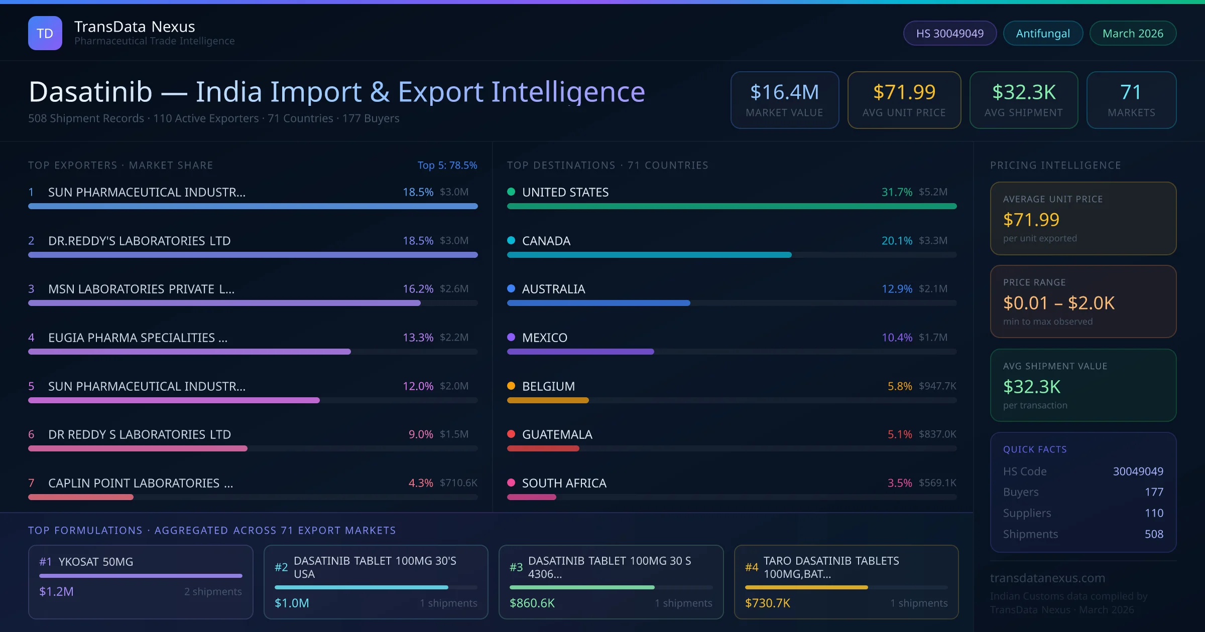 Between 2022 and 2026, India exported $16.4M worth of dasatinib across 508 verified shipments to 71 countries — covering 36% of world markets in the Advanced Oncology segment. The largest destination is UNITED STATES (31.7%). SUN PHARMACEUTICAL INDUSTRIES LIMITED leads with a 18.5% share. All figures are drawn from Indian Customs (DGFT) shipping bill records spanning four years of trade activity.