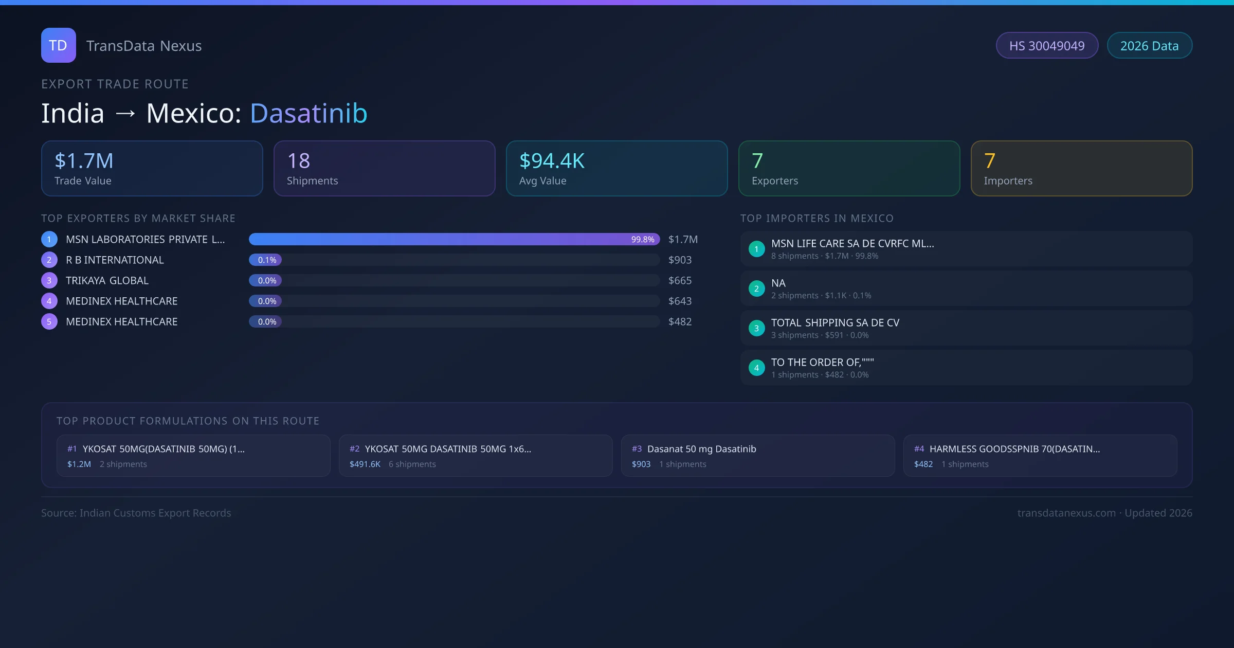 - 1.Route Identification: India to Mexico export trade corridor identified from Indian Customs (DGFT) records for Dasatinib.