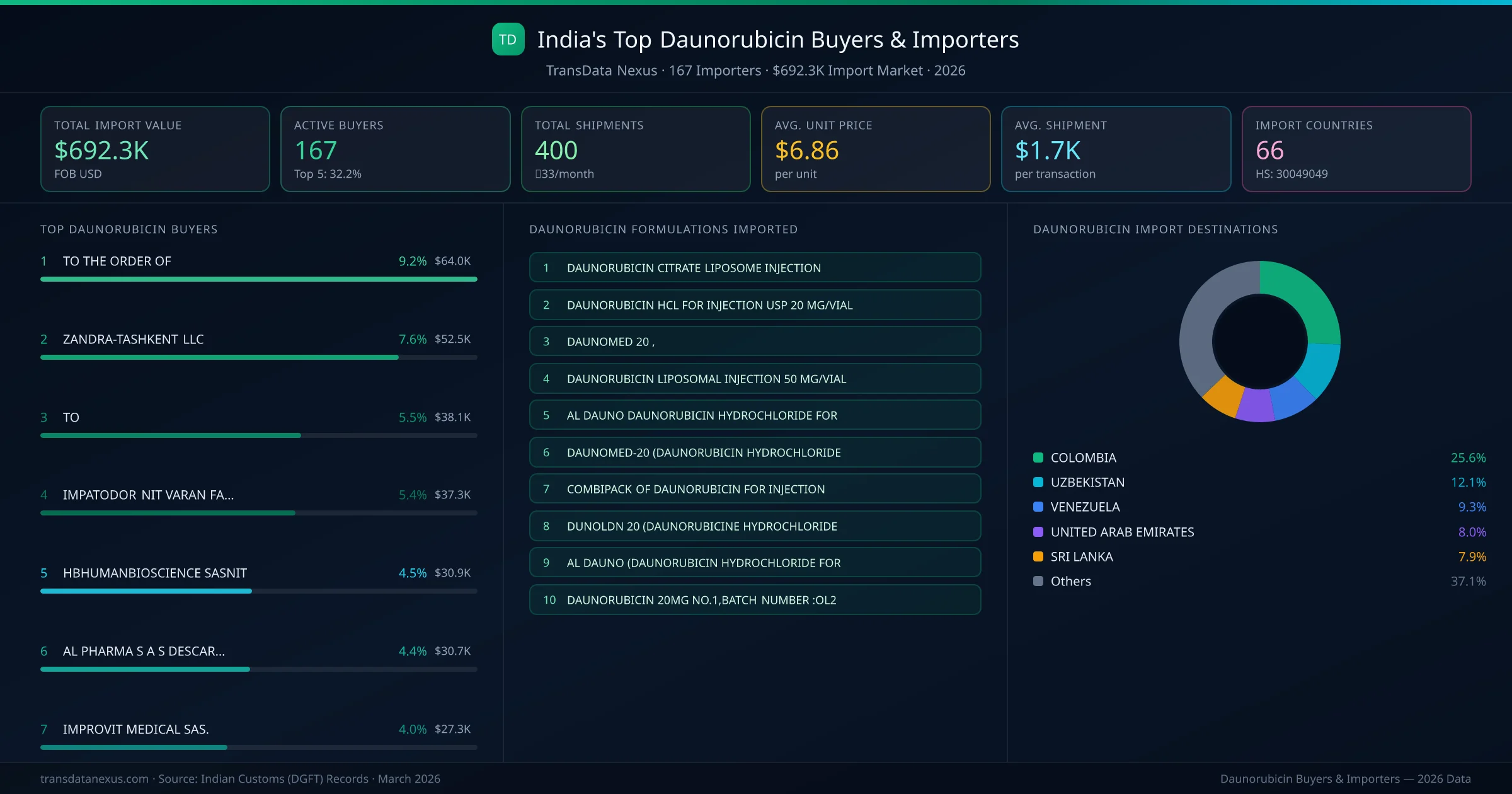 ZANDRA-TASHKENT LLC (UZBEKISTAN) is the leading daunorubicin importer from India, holding a 7.6% share of the $692.3K market across 400 shipments from 167 buyers. The top 5 buyers — ZANDRA-TASHKENT LLC (UZBEKISTAN), IMPATODOR NIT VARAN FARMA (COLOMBIA), AL PHARMA S A S DESCARGUE DIRECTO (COLOMBIA), IMPROVIT MEDICAL SAS. (COLOMBIA), THE IMPORT MANAGER INTERNATIONAL SA (UNITED ARAB EMIRATES) — collectively control 25.1% of total import value.