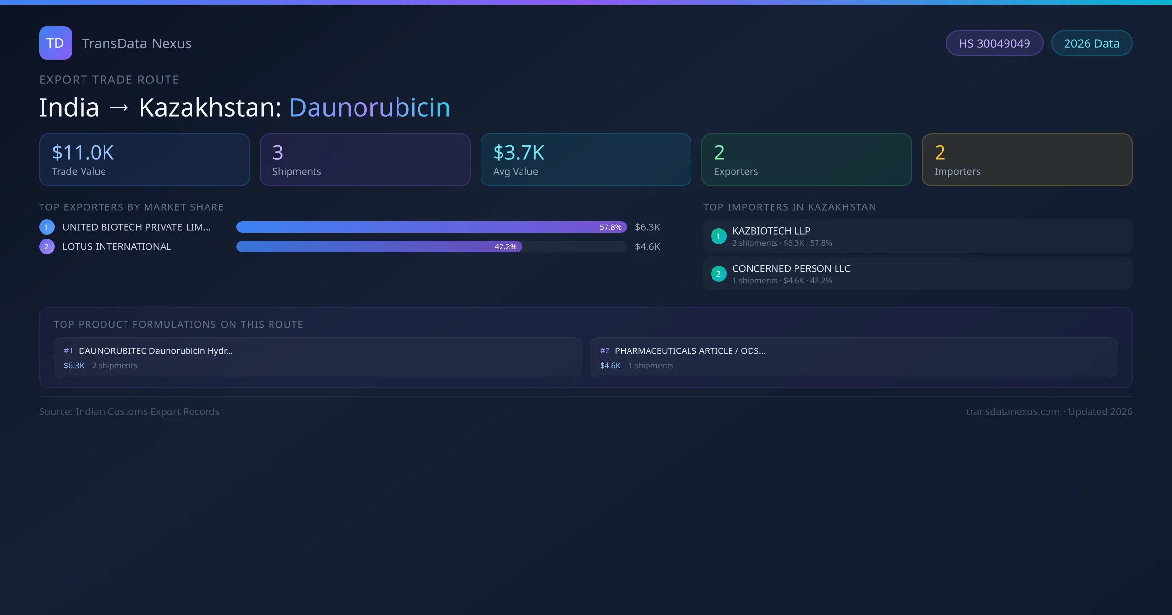 The India to Kazakhstan Daunorubicin corridor is one of India's established pharmaceutical export routes, with 3 shipments documented worth a combined $11.0K USD. The route is dominated by UNITED BIOTECH PRIVATE LIMITED, which alone accounts for roughly 58% of all export value, reflecting the consolidated nature of India's daunorubicin manufacturing sector.