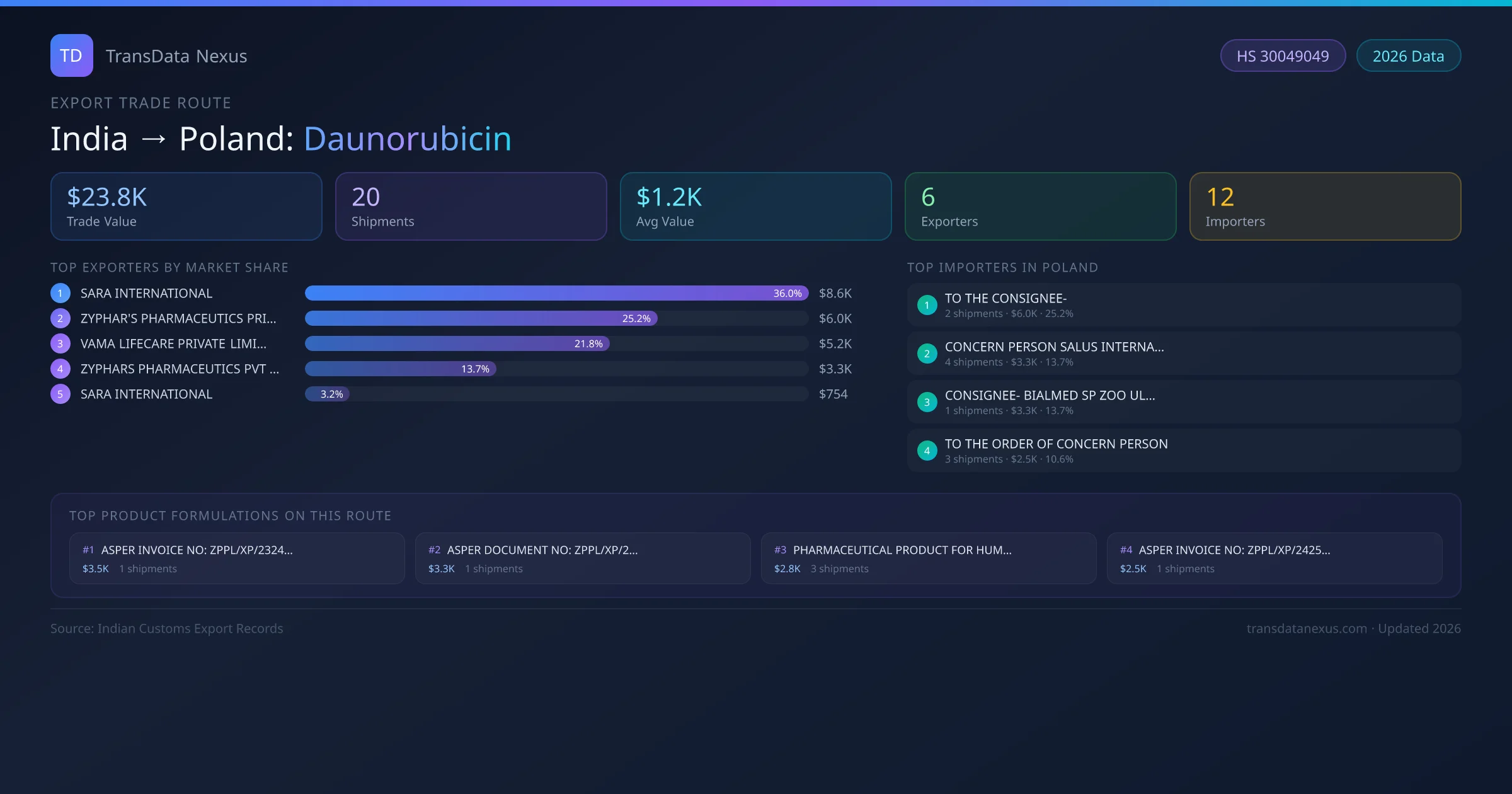 India has recorded 20 verified shipments of Daunorubicin exported to Poland, representing a combined trade value of $23.8K USD. This corridor is served by 6 active Indian exporters, with an average shipment value of $1.2K USD. The leading Indian exporter is SARA INTERNATIONAL, which accounts for 36% of total export value with 9 shipments worth $8.6K USD. On the buying side, TO THE CONSIGNEE- is the largest importer in Poland with $6.0K USD in purchases. The top 3 suppliers — SARA INTERNATIONAL, ZYPHAR'S PHARMACEUTICS PRIVATE LIMITED, VAMA LIFECARE PRIVATE LIMITED — together control 83% of total trade value on this route. All data sourced from Indian Customs (DGFT) shipping bill records. Values reported in FOB USD.