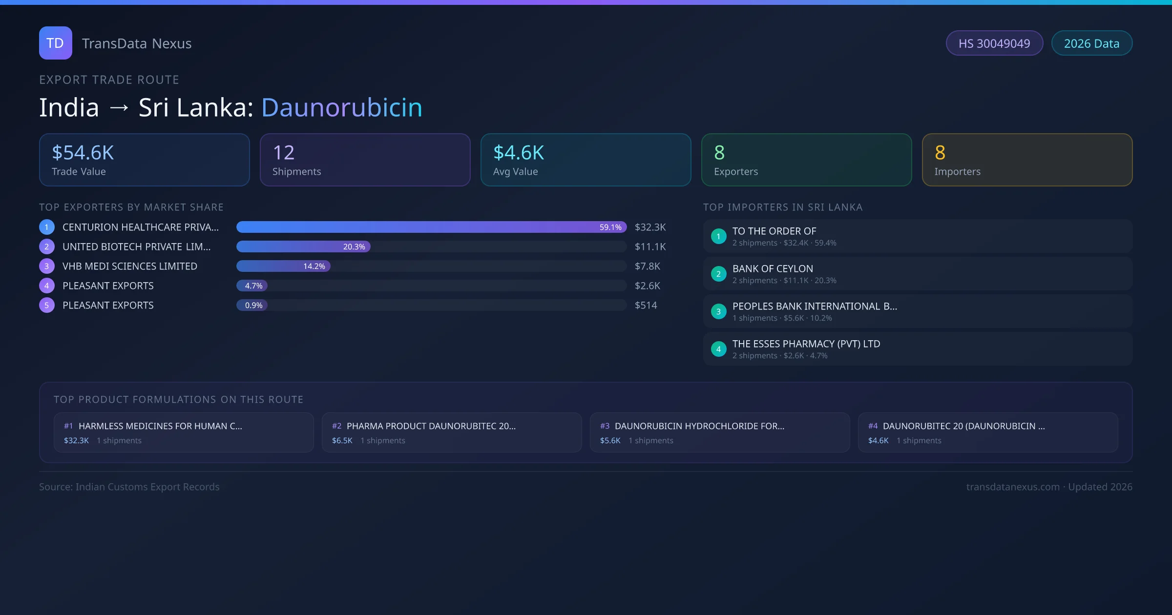 - 1.Route Identification: India to Sri Lanka export trade corridor identified from Indian Customs (DGFT) records for Daunorubicin.