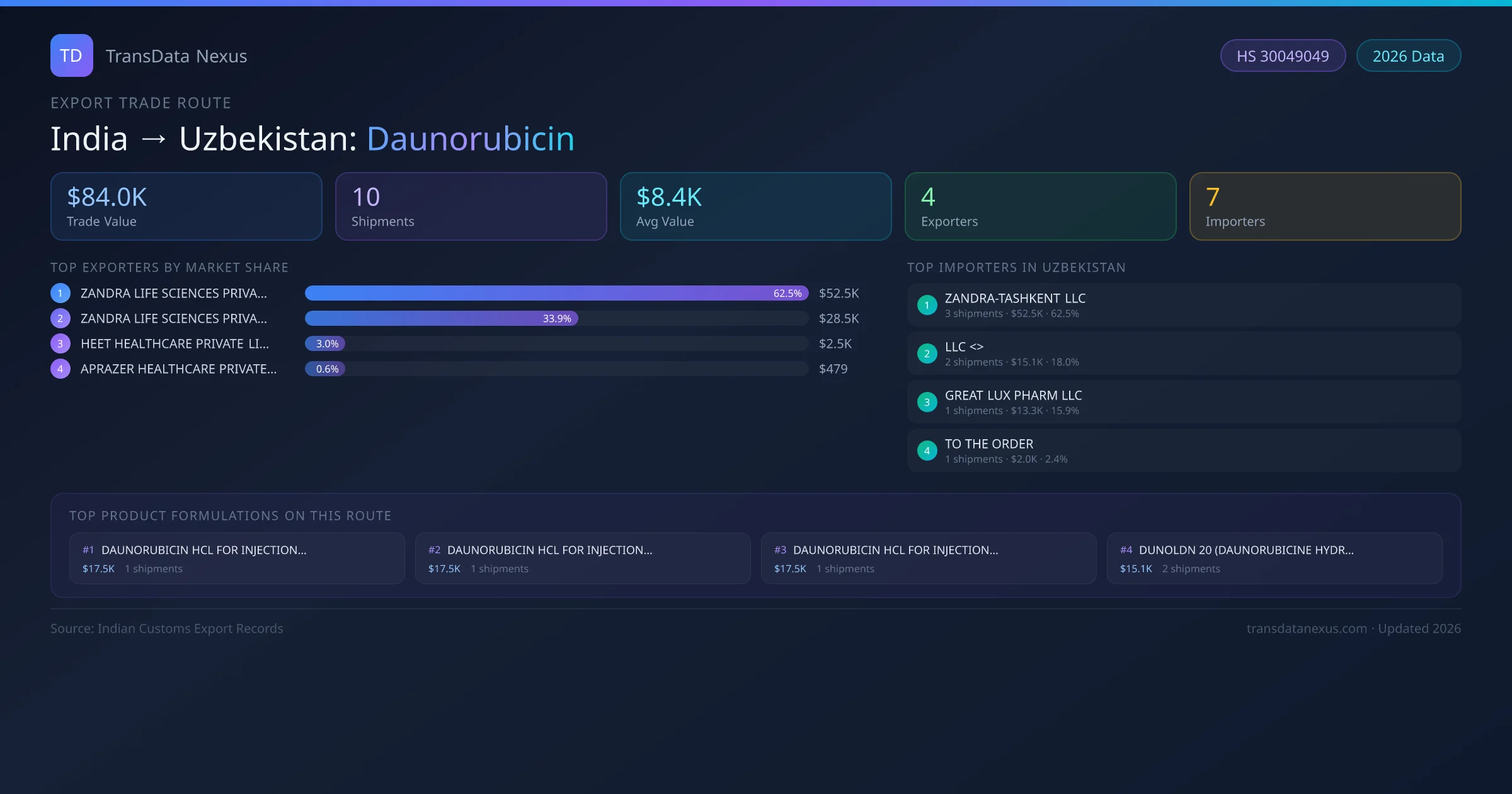 The India to Uzbekistan Daunorubicin corridor is one of India's established pharmaceutical export routes, with 10 shipments documented worth a combined $84.0K USD. The route is dominated by ZANDRA LIFE SCIENCES PRIVATE LIMITED, which alone accounts for roughly 63% of all export value, reflecting the consolidated nature of India's daunorubicin manufacturing sector.