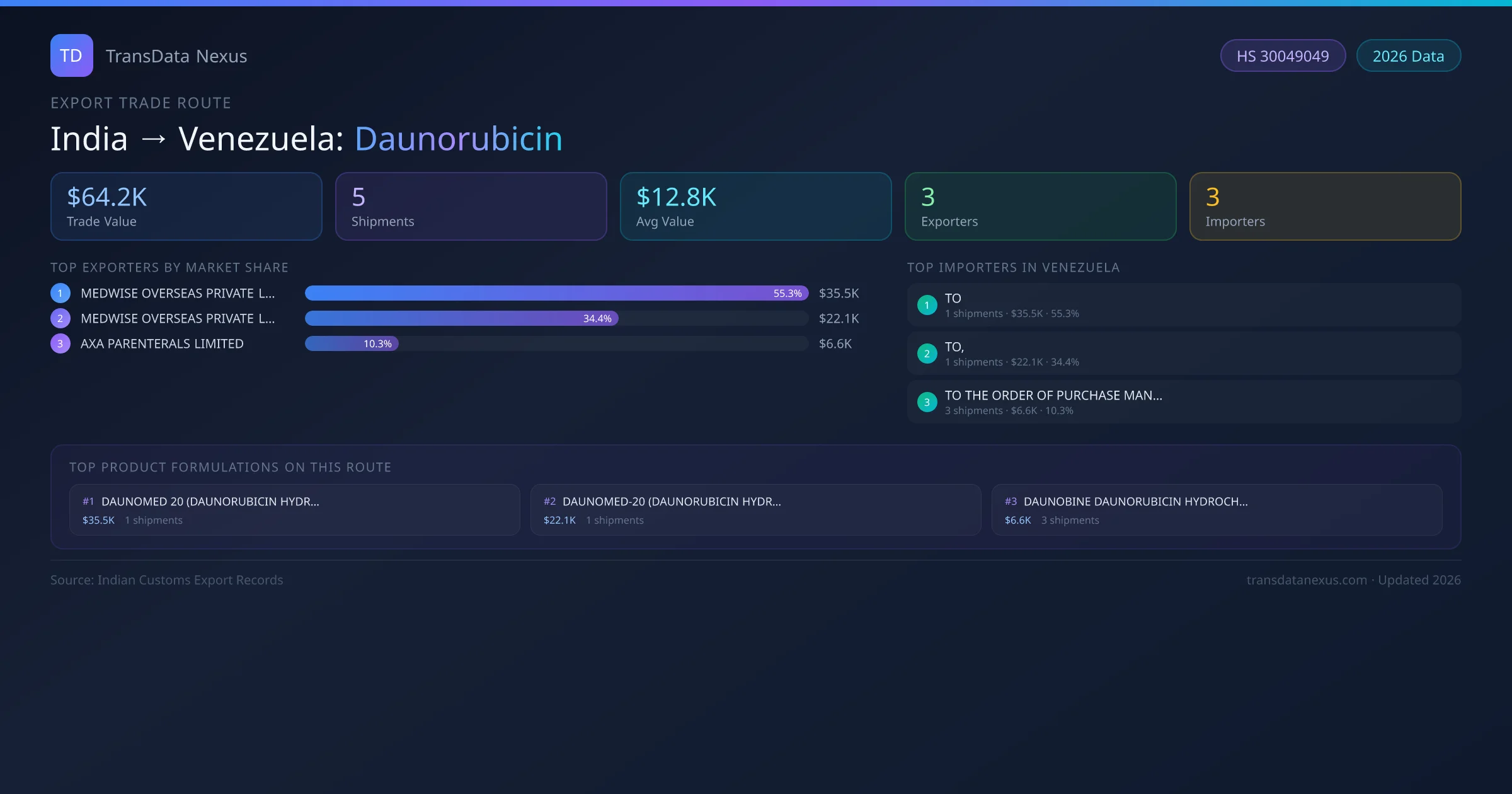 India has recorded 5 verified shipments of Daunorubicin exported to Venezuela, representing a combined trade value of $64.2K USD. This corridor is served by 3 active Indian exporters, with an average shipment value of $12.8K USD. The leading Indian exporter is MEDWISE OVERSEAS PRIVATE LIMITED, which accounts for 55% of total export value with 1 shipments worth $35.5K USD. On the buying side, TO is the largest importer in Venezuela with $35.5K USD in purchases. The top 3 suppliers — MEDWISE OVERSEAS PRIVATE LIMITED, MEDWISE OVERSEAS PRIVATE LIMITED , AXA PARENTERALS LIMITED — together control 100% of total trade value on this route. All data sourced from Indian Customs (DGFT) shipping bill records. Values reported in FOB USD.