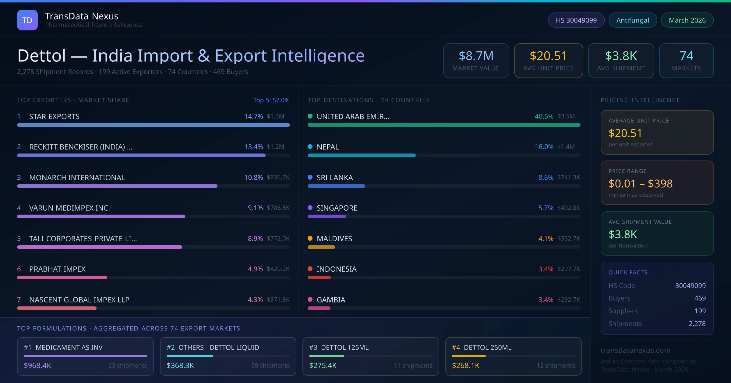 The total export value of dettol from India is $8.7M, recorded across 2,278 shipments from 199 active exporters to 74 countries. The average shipment value is $3.8K.