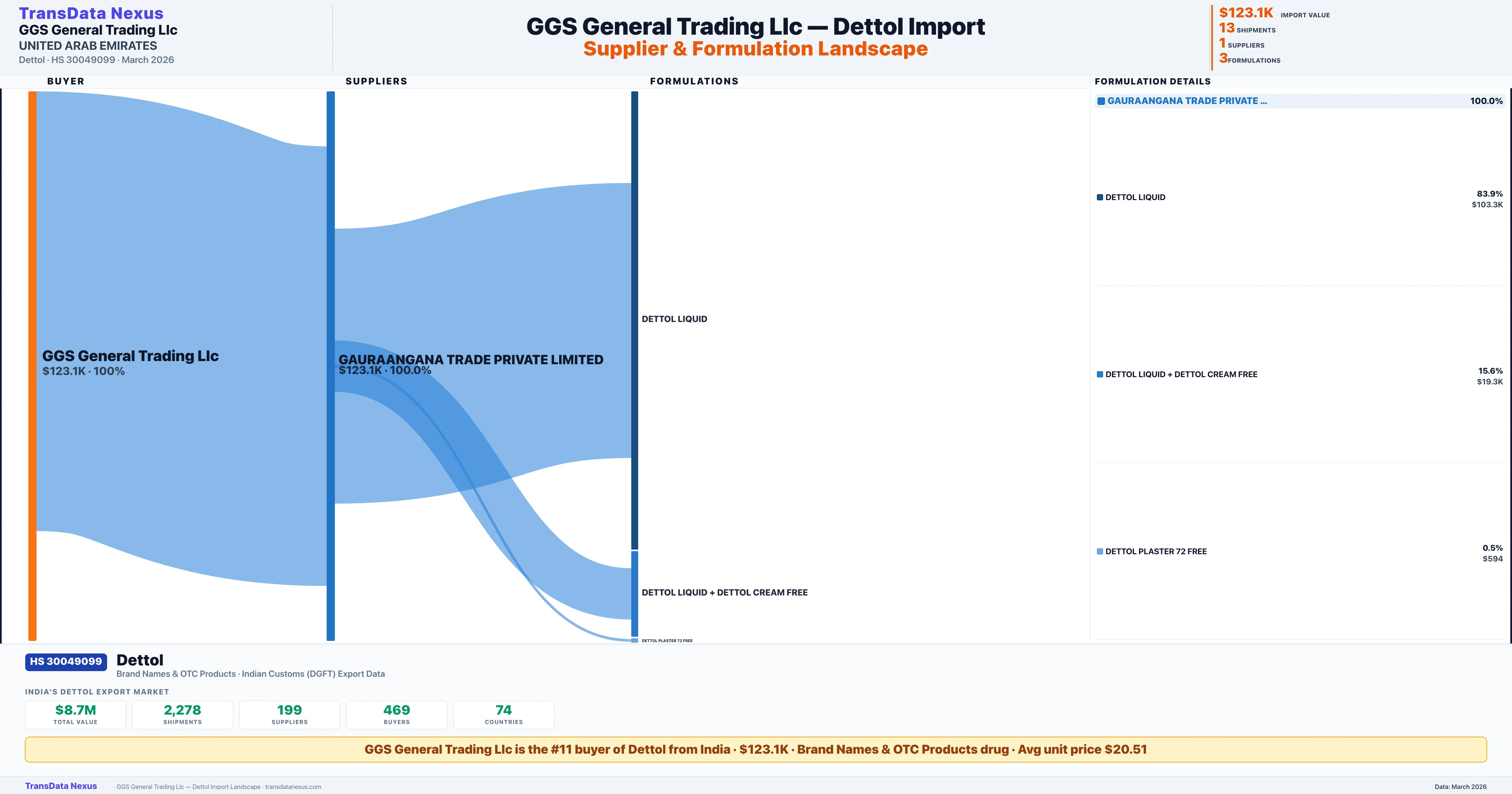 GGS GENERAL TRADING LLC sources Dettol from 1 verified Indian supplier: GAURAANGANA TRADE PRIVATE LIMITED ($123.1K, 100.0%). This is based on 13 customs records.