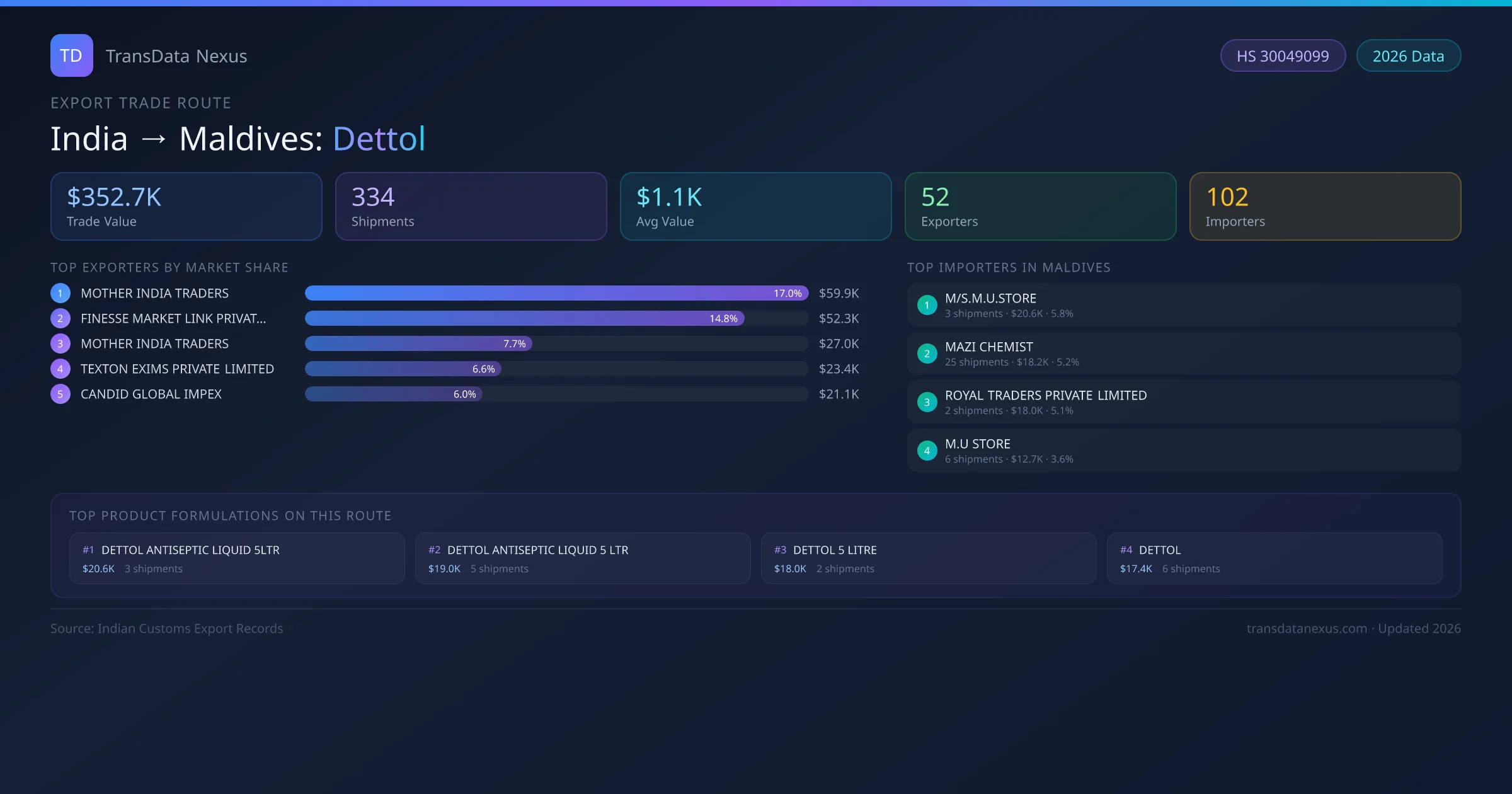 The India to Maldives Dettol corridor is one of India's established pharmaceutical export routes, with 334 shipments documented worth a combined $352.7K USD. The route is dominated by MOTHER INDIA TRADERS, which alone accounts for roughly 17% of all export value, reflecting the consolidated nature of India's dettol manufacturing sector.