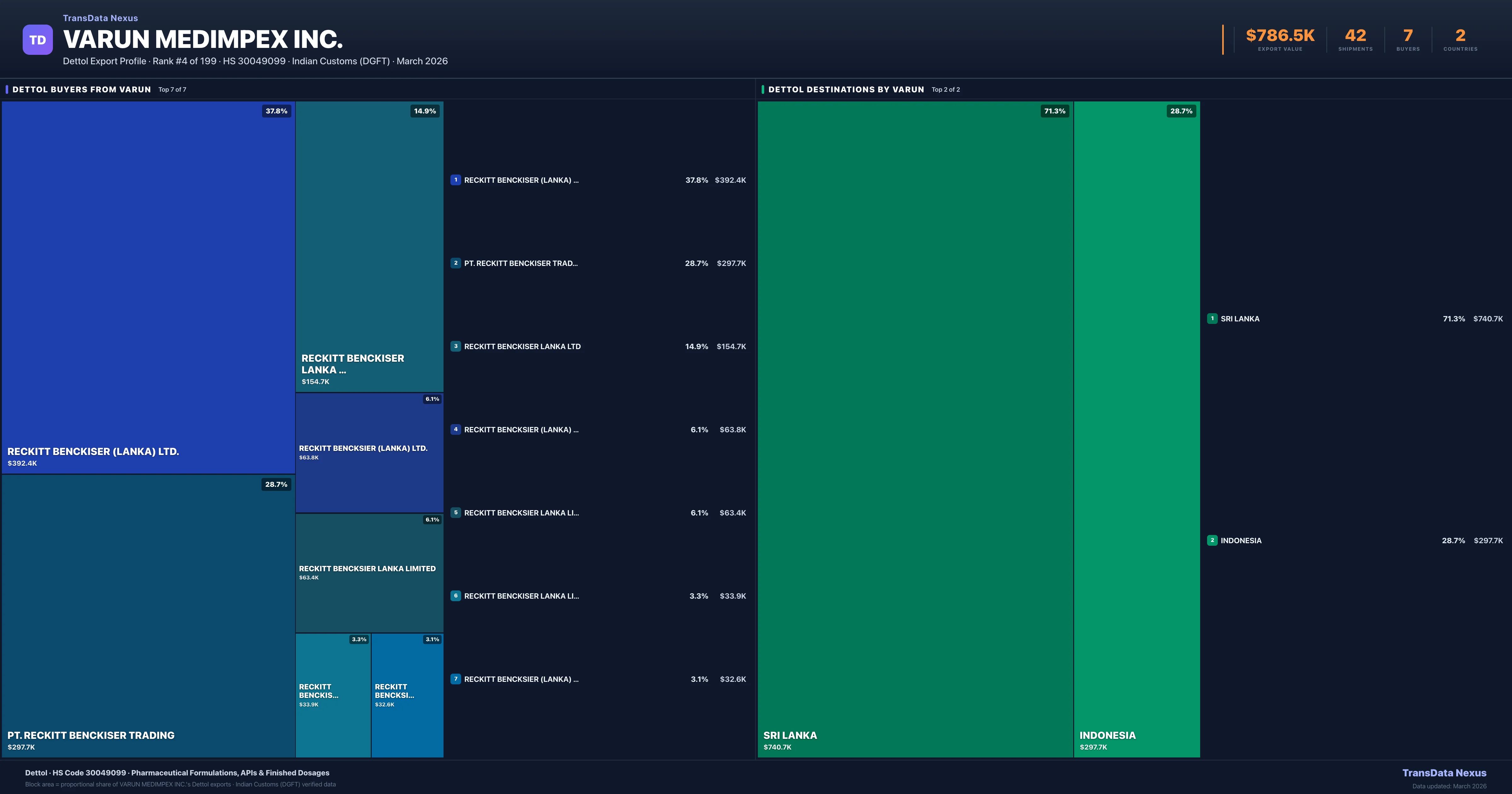 Varun Medimpex Inc. supplies Dettol to 7 buyers globally. The largest buyer is RECKITT BENCKISER (LANKA) LTD. (SRI LANKA), followed by PT. RECKITT BENCKISER TRADING (INDONESIA) and RECKITT BENCKISER LANKA LTD (SRI LANKA). These buyers represent pharmaceutical distributors, hospital groups, and government procurement agencies in their respective markets.