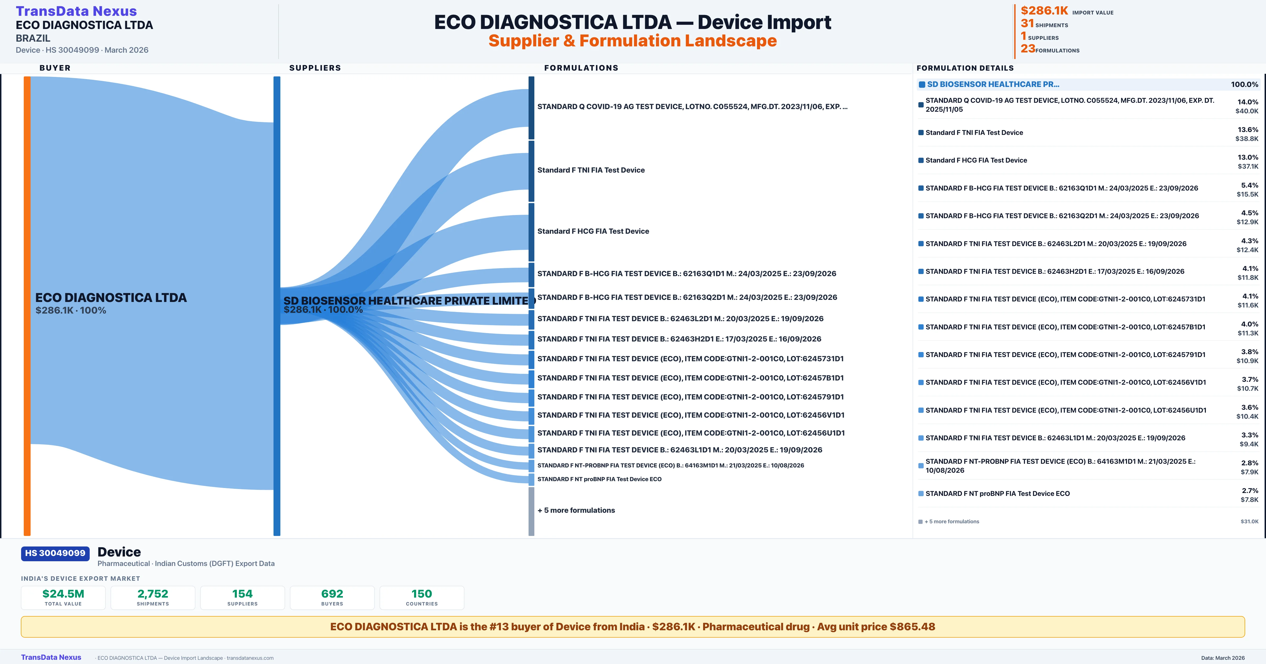 ECO DIAGNOSTICA LTDA sources Device from 1 verified Indian supplier based on 31 customs records. The primary supplier is SD BIOSENSOR HEALTHCARE PRIVATE LIMITED accounting for 100.0% of imports.