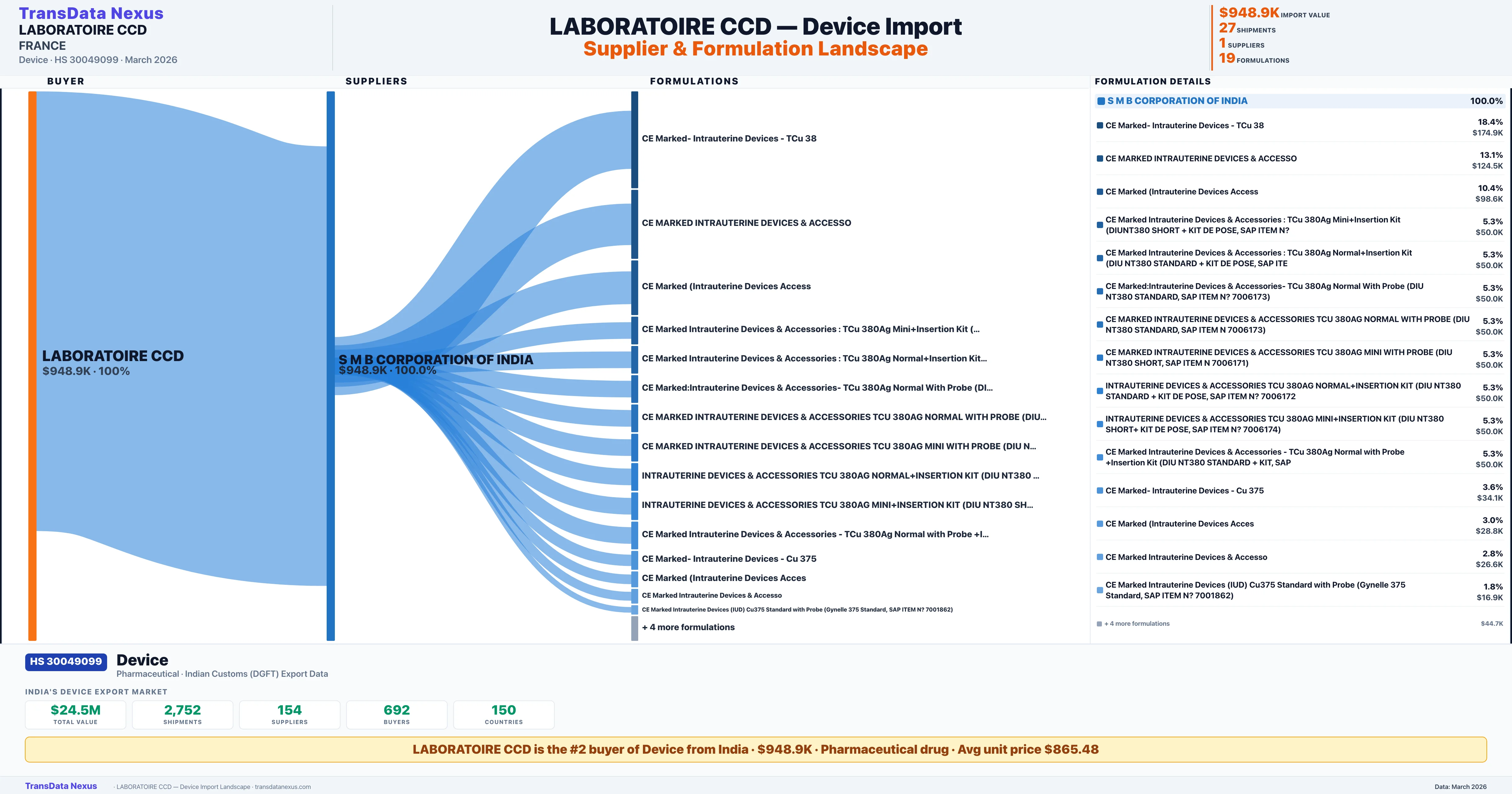 LABORATOIRE CCD imports 19 distinct Device formulations from India. The top formulation is CE Marked- Intrauterine Devices - TCu 38 with 4 shipments worth $174.9K.
