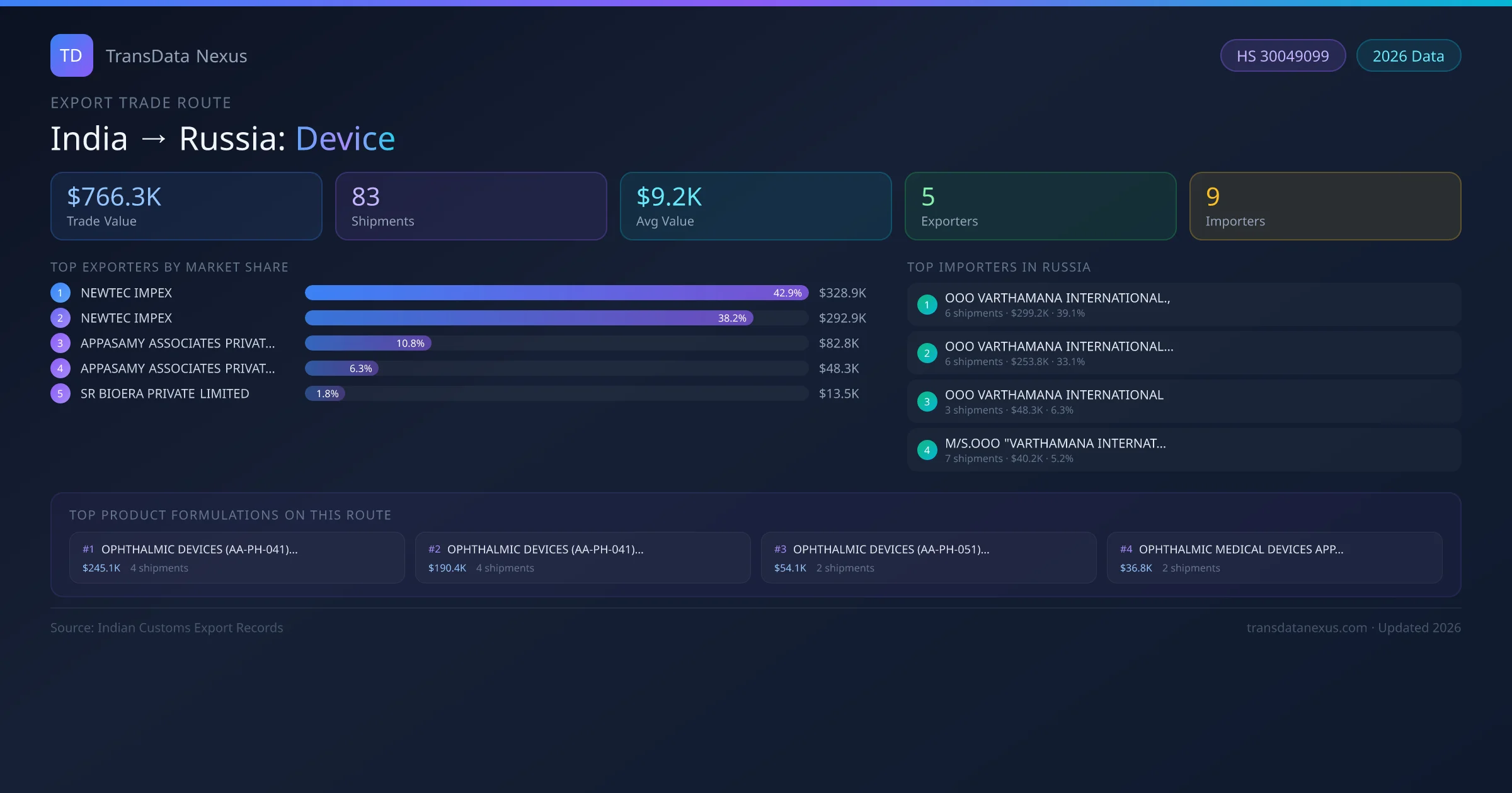 India has recorded 83 verified shipments of Device exported to Russia, representing a combined trade value of $766.3K USD. This corridor is served by 5 active Indian exporters, with an average shipment value of $9.2K USD. The leading Indian exporter is NEWTEC IMPEX, which accounts for 43% of total export value with 7 shipments worth $328.9K USD. On the buying side, OOO VARTHAMANA INTERNATIONAL., is the largest importer in Russia with $299.2K USD in purchases. The top 3 suppliers — NEWTEC IMPEX, NEWTEC IMPEX , APPASAMY ASSOCIATES PRIVATE LIMITED — together control 92% of total trade value on this route. All data sourced from Indian Customs (DGFT) shipping bill records. Values reported in FOB USD.