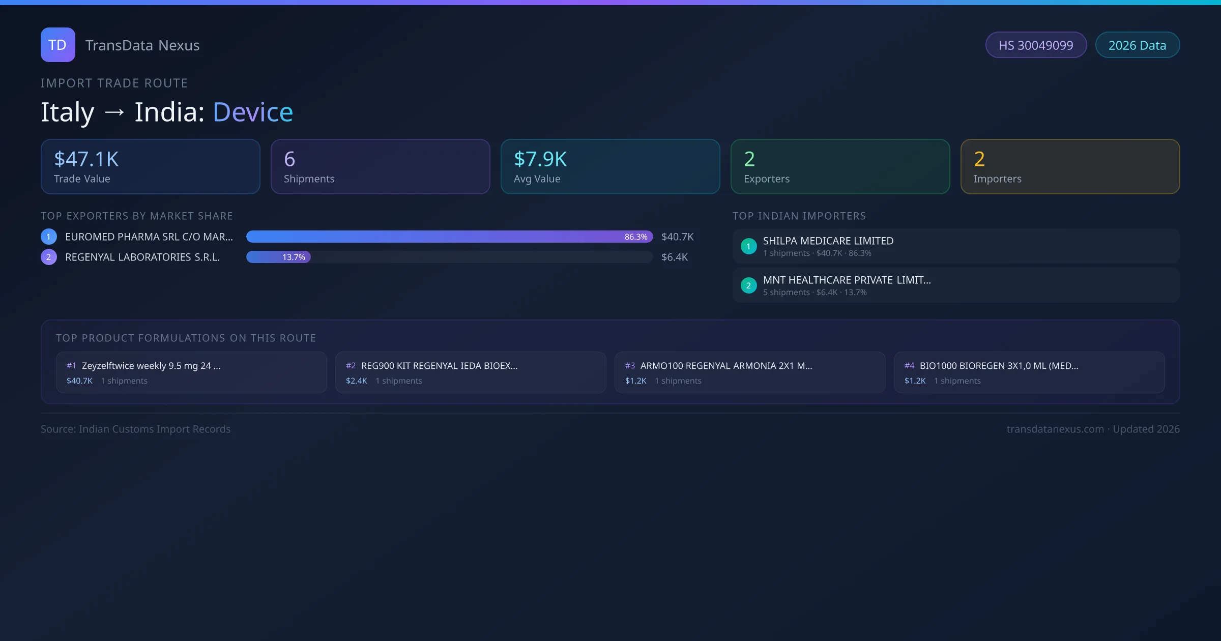 The Italy to India Device corridor is one of India's established pharmaceutical import routes from Italy, with 6 shipments documented worth a combined $47.1K USD. The route is dominated by EUROMED PHARMA SRL C/O MARKEN , which alone accounts for roughly 86% of all import value, reflecting the consolidated nature of Italy's device export sector.