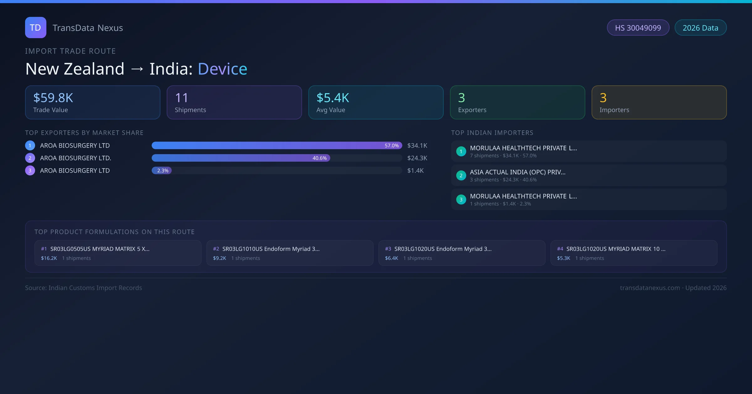 The New Zealand to India Device corridor is one of India's established pharmaceutical import routes from New Zealand, with 11 shipments documented worth a combined $59.8K USD. The route is dominated by AROA BIOSURGERY LTD, which alone accounts for roughly 57% of all import value, reflecting the consolidated nature of New Zealand's device export sector.