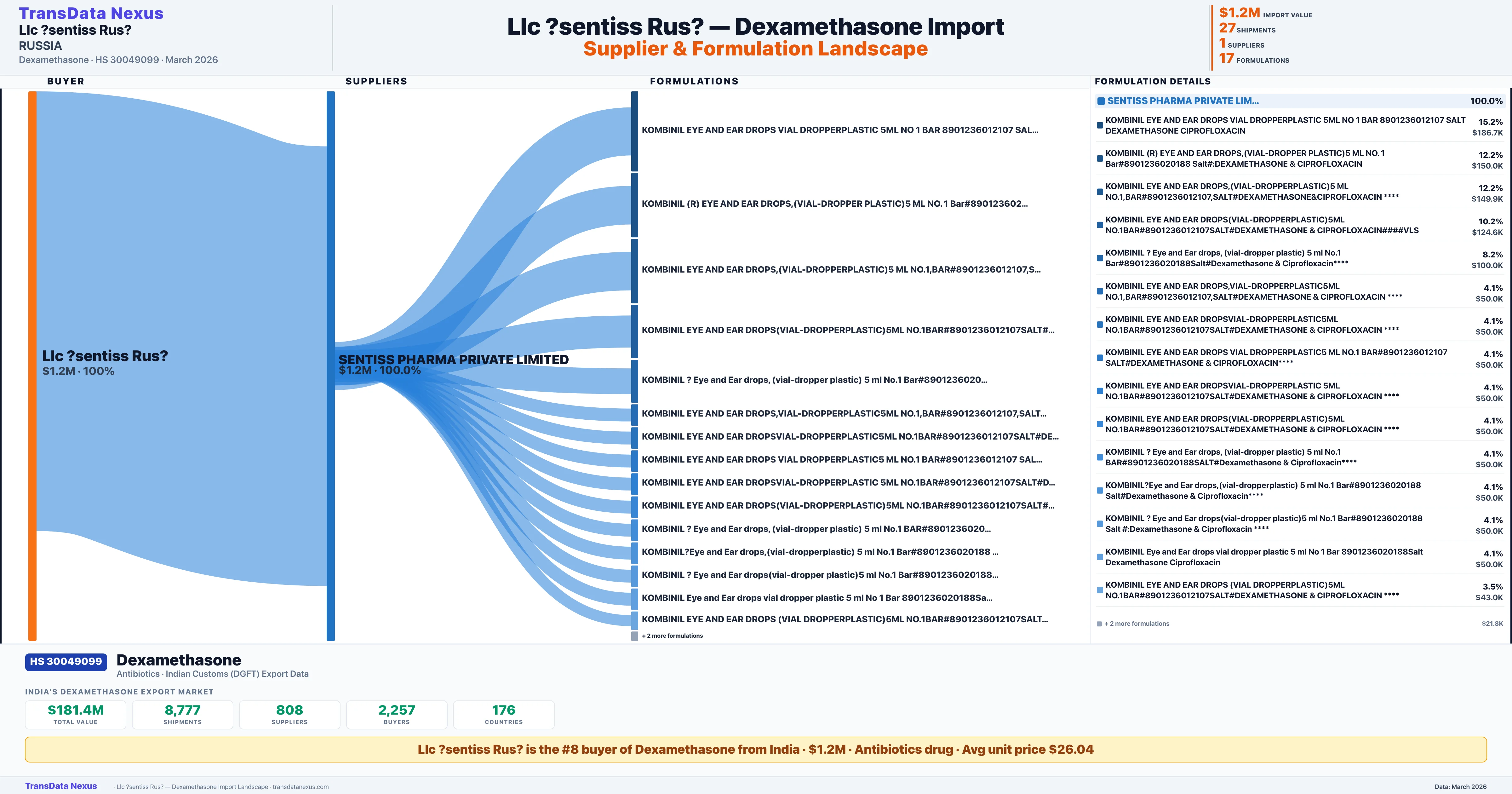 LLC SENTISS RUS sources Dexamethasone from 1 verified Indian supplier: SENTISS PHARMA PRIVATE LIMITED ($1.2M, 100.0%). This is based on 27 customs records.