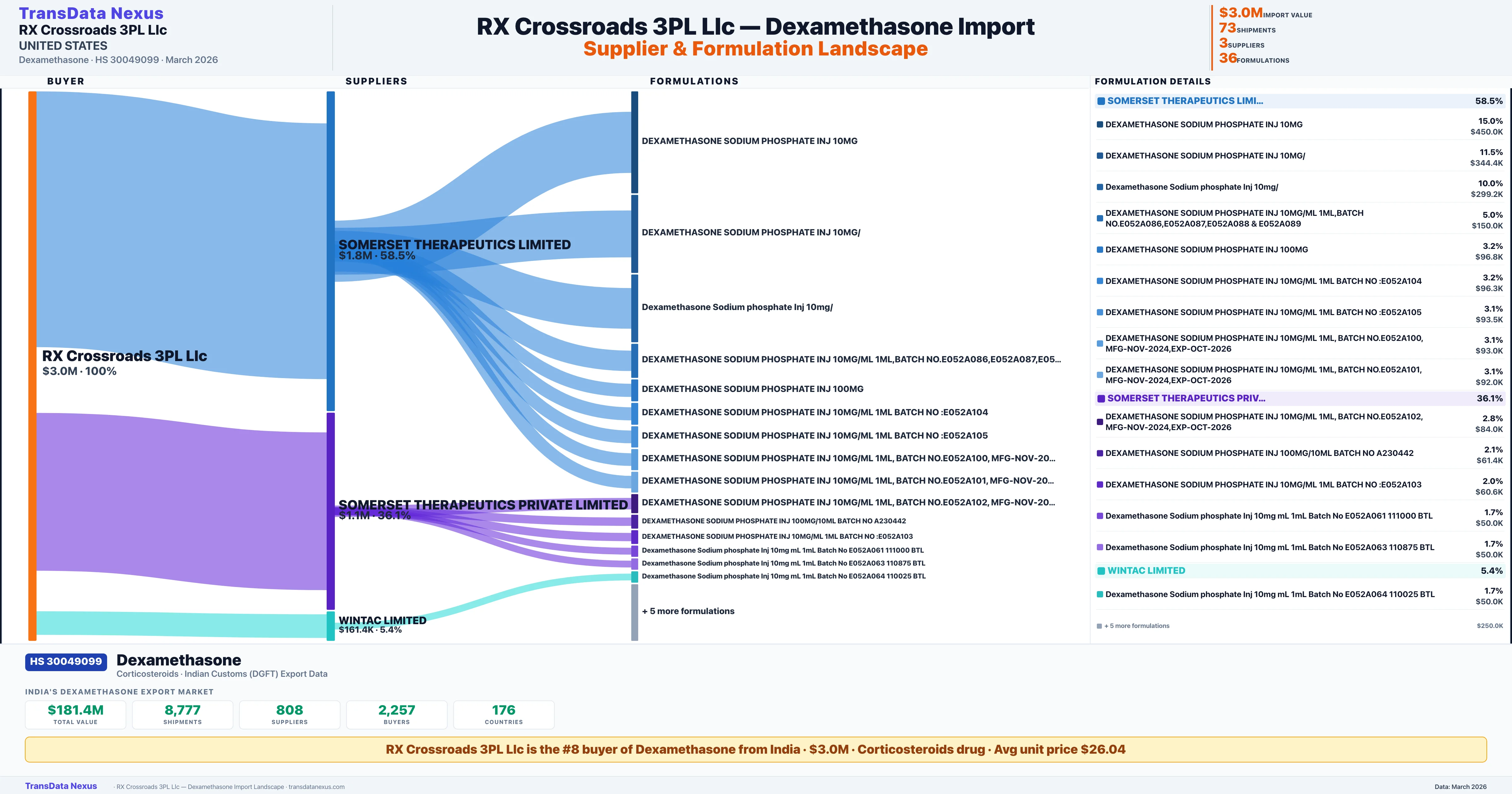 RX CROSSROADS 3PL LLC sources Dexamethasone from 3 verified Indian suppliers: SOMERSET THERAPEUTICS LIMITED ($1.8M, 58.5%), SOMERSET THERAPEUTICS PRIVATE LIMITED ($1.1M, 36.1%), WINTAC LIMITED ($161.4K, 5.4%). This is based on 73 customs records.