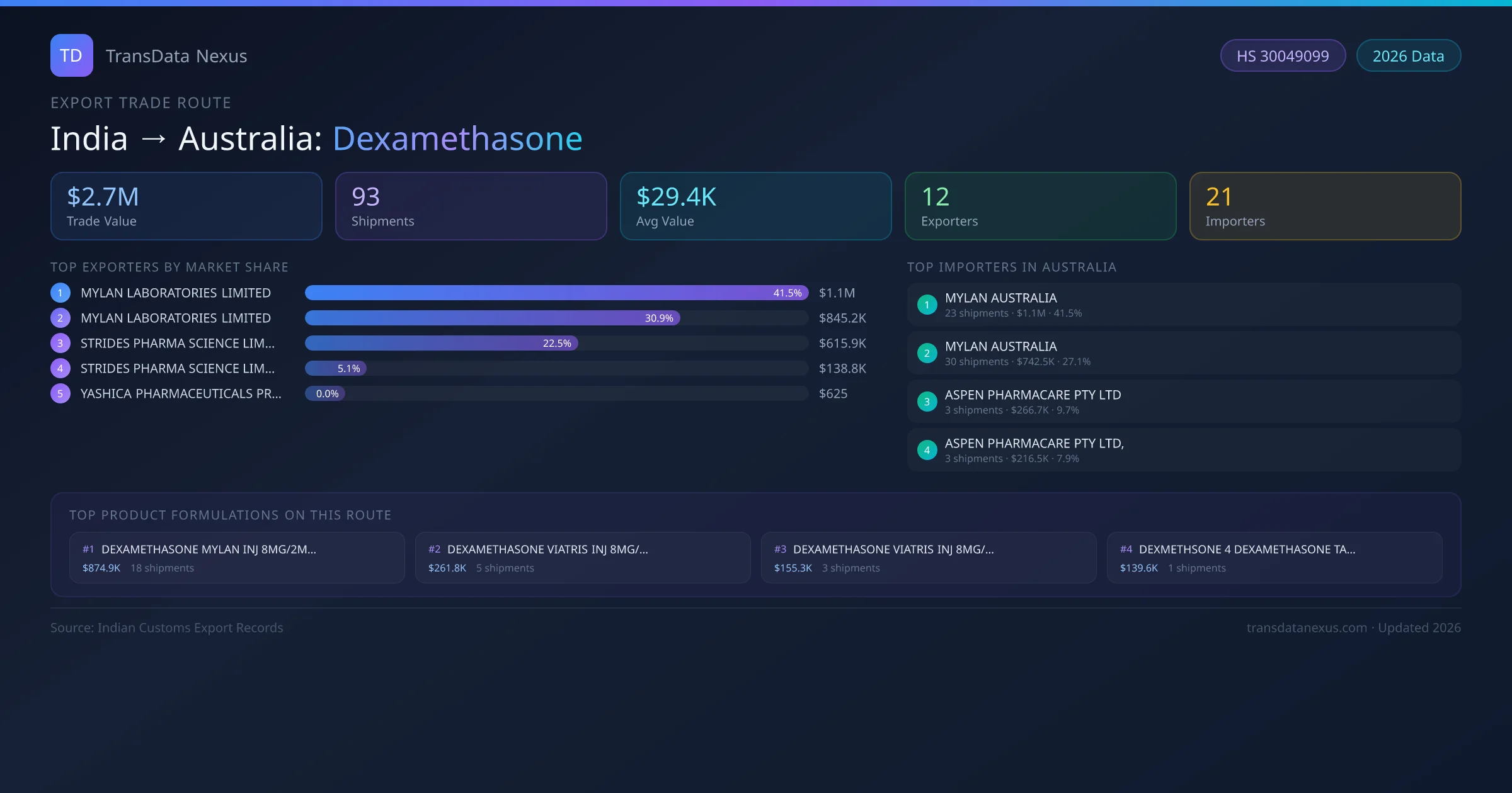 The India to Australia Dexamethasone corridor is one of India's established pharmaceutical export routes, with 93 shipments documented worth a combined $2.7M USD. The route is dominated by MYLAN LABORATORIES LIMITED , which alone accounts for roughly 41% of all export value, reflecting the consolidated nature of India's dexamethasone manufacturing sector.