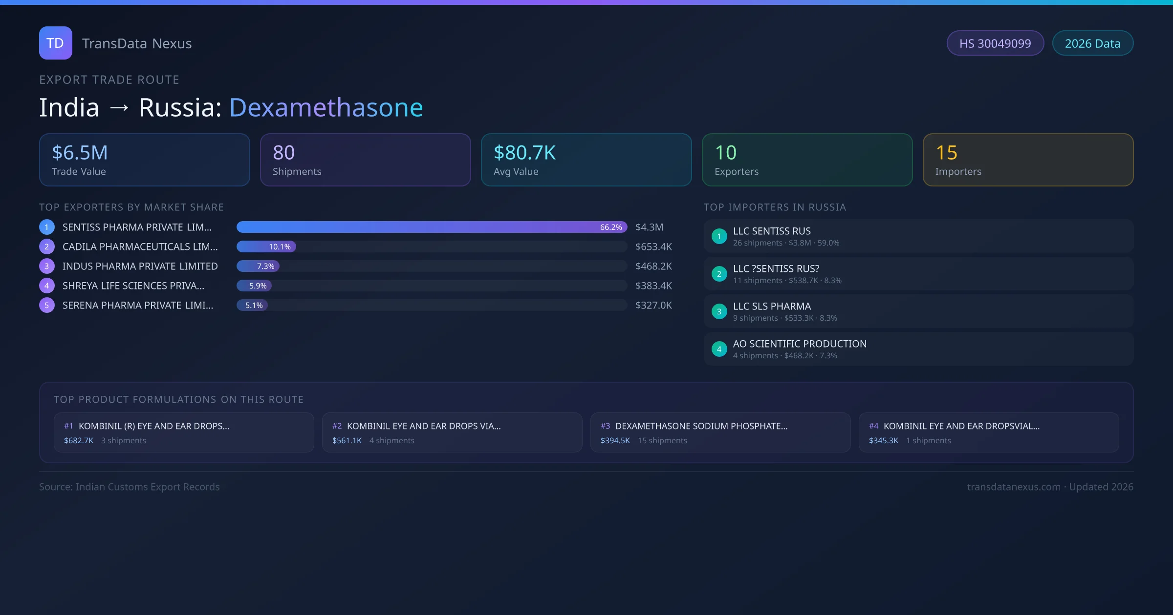 The India to Russia Dexamethasone corridor is one of India's established pharmaceutical export routes, with 80 shipments documented worth a combined $6.5M USD. The route is dominated by SENTISS PHARMA PRIVATE LIMITED, which alone accounts for roughly 66% of all export value, reflecting the consolidated nature of India's dexamethasone manufacturing sector.