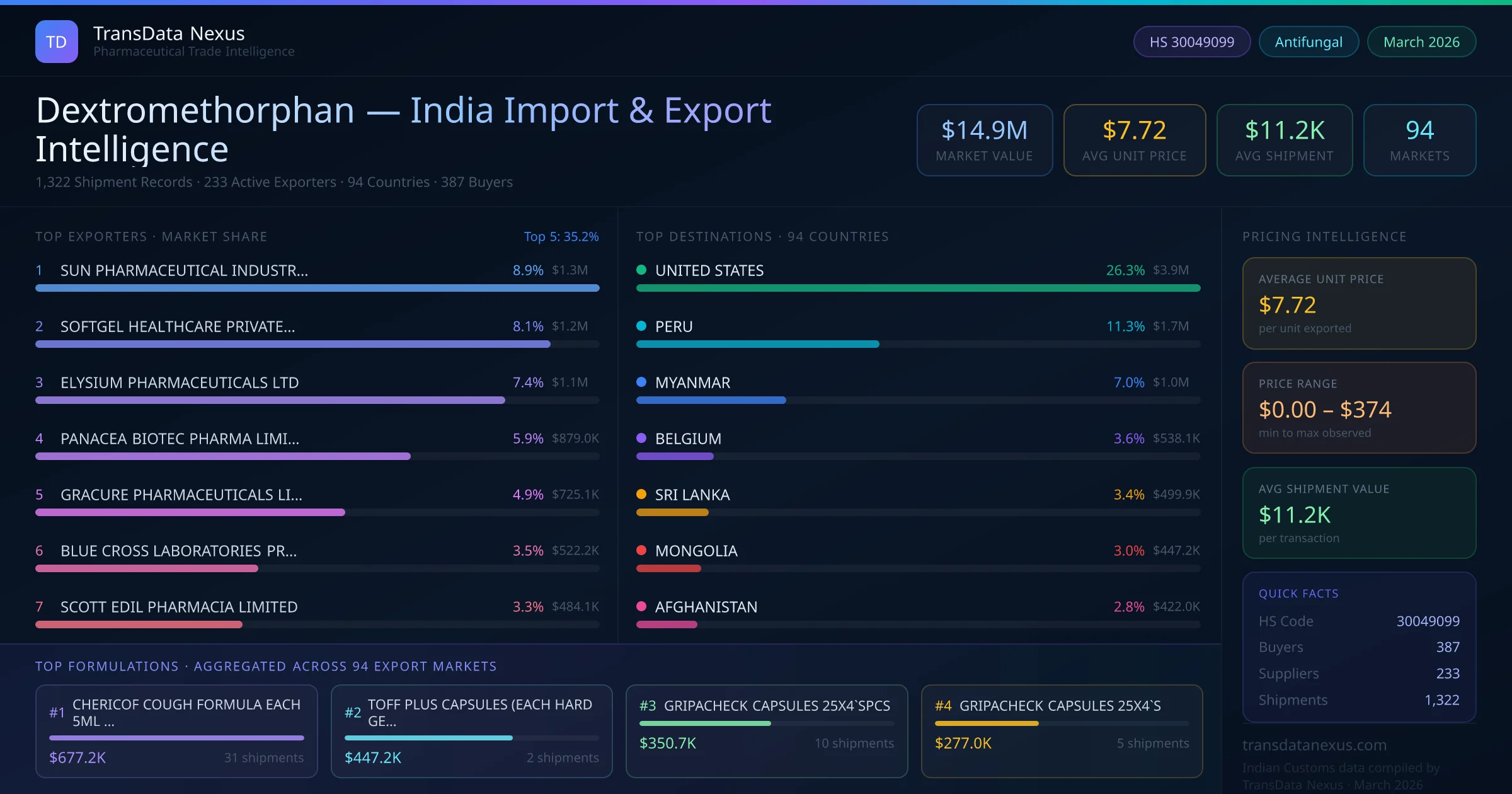 Between 2022 and 2026, India exported $14.9M worth of dextromethorphan across 1,322 verified shipments to 94 countries — covering 48% of world markets in the Respiratory & OTC segment. The largest destination is UNITED STATES (26.3%). SUN PHARMACEUTICAL INDUSTRIES LIMITED leads with a 8.9% share. All figures are drawn from Indian Customs (DGFT) shipping bill records spanning four years of trade activity.