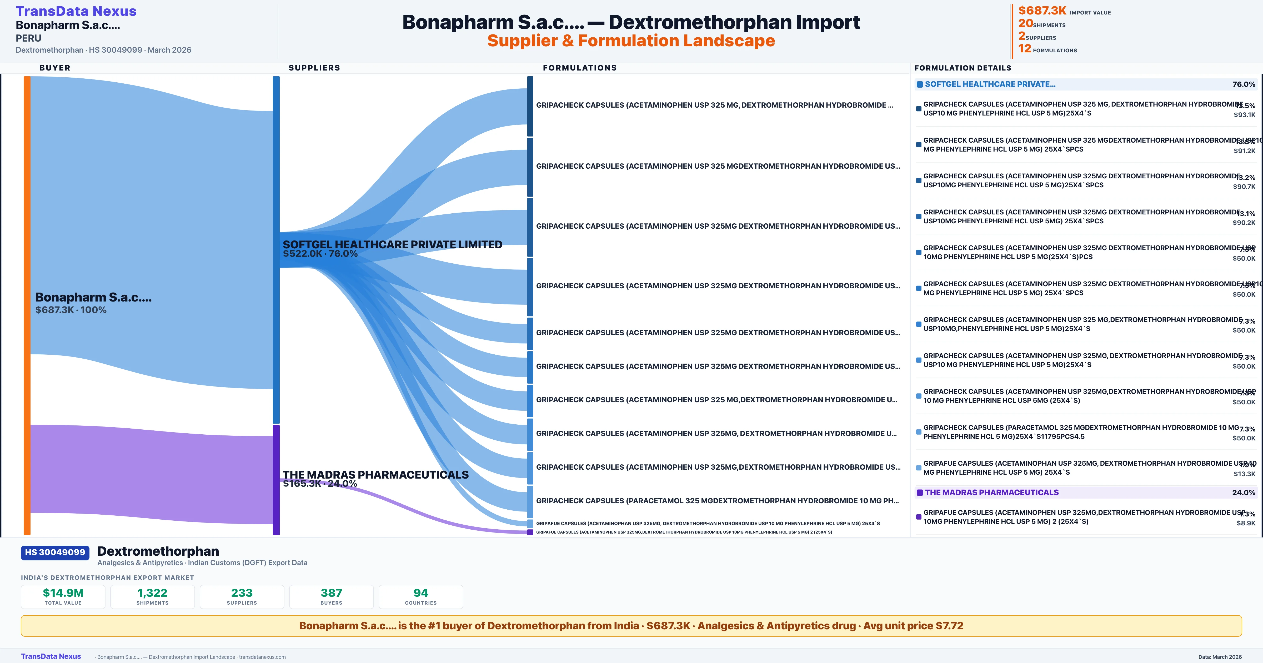 BONAPHARM S.A.C.... sources Dextromethorphan from 2 verified Indian suppliers: SOFTGEL HEALTHCARE PRIVATE LIMITED ($522.0K, 76.0%), THE MADRAS PHARMACEUTICALS ($165.3K, 24.0%). This is based on 20 customs records.