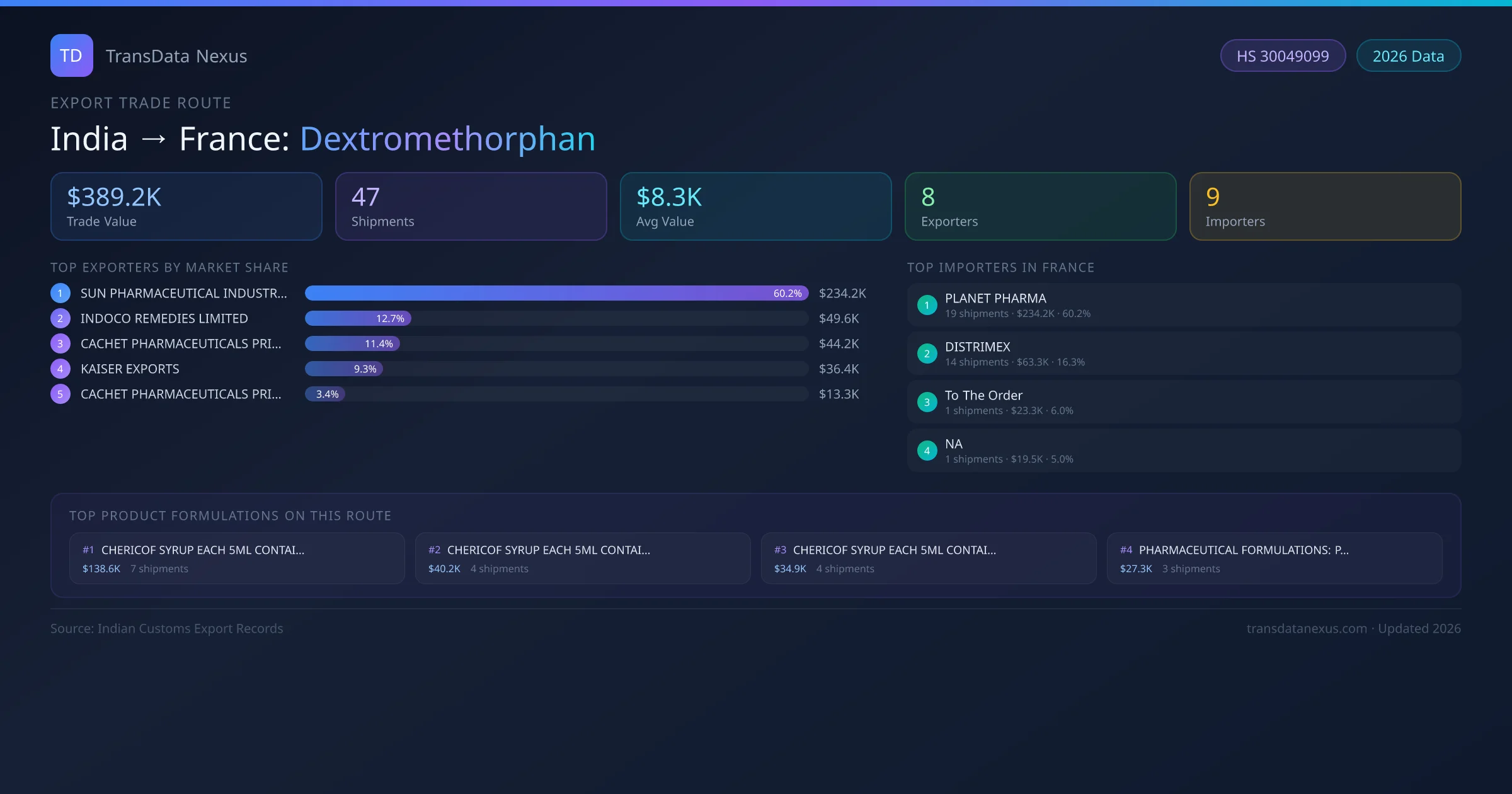 India has recorded 47 verified shipments of Dextromethorphan exported to France, representing a combined trade value of $389.2K USD. This corridor is served by 8 active Indian exporters, with an average shipment value of $8.3K USD. The leading Indian exporter is SUN PHARMACEUTICAL INDUSTRIES LIMITED, which accounts for 60% of total export value with 19 shipments worth $234.2K USD. On the buying side, PLANET PHARMA is the largest importer in France with $234.2K USD in purchases. The top 3 suppliers — SUN PHARMACEUTICAL INDUSTRIES LIMITED, INDOCO REMEDIES LIMITED, CACHET PHARMACEUTICALS PRIVATE LIMITED — together control 84% of total trade value on this route. All data sourced from Indian Customs (DGFT) shipping bill records. Values reported in FOB USD.