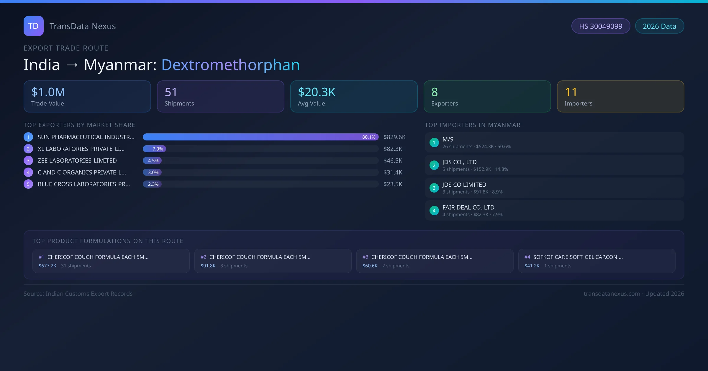 India has recorded 51 verified shipments of Dextromethorphan exported to Myanmar, representing a combined trade value of $1.0M USD. This corridor is served by 8 active Indian exporters, with an average shipment value of $20.3K USD. The leading Indian exporter is SUN PHARMACEUTICAL INDUSTRIES LIMITED, which accounts for 80% of total export value with 36 shipments worth $829.6K USD. On the buying side, M/S is the largest importer in Myanmar with $524.3K USD in purchases. The top 3 suppliers — SUN PHARMACEUTICAL INDUSTRIES LIMITED, XL LABORATORIES PRIVATE LIMITED, ZEE LABORATORIES LIMITED — together control 92% of total trade value on this route. All data sourced from Indian Customs (DGFT) shipping bill records. Values reported in FOB USD.