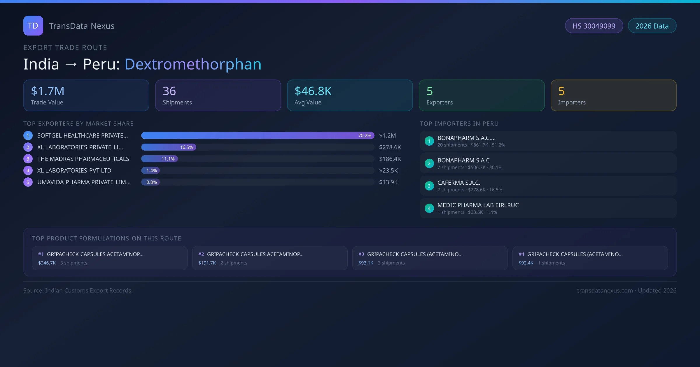 - 1.Route Identification: India to Peru export trade corridor identified from Indian Customs (DGFT) records for Dextromethorphan.