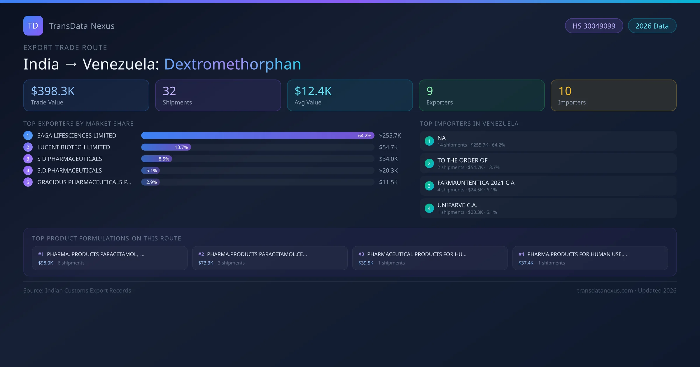 India has recorded 32 verified shipments of Dextromethorphan exported to Venezuela, representing a combined trade value of $398.3K USD. This corridor is served by 9 active Indian exporters, with an average shipment value of $12.4K USD. The leading Indian exporter is SAGA LIFESCIENCES LIMITED, which accounts for 64% of total export value with 14 shipments worth $255.7K USD. On the buying side, NA is the largest importer in Venezuela with $255.7K USD in purchases. The top 3 suppliers — SAGA LIFESCIENCES LIMITED, LUCENT BIOTECH LIMITED, S D PHARMACEUTICALS — together control 86% of total trade value on this route. All data sourced from Indian Customs (DGFT) shipping bill records. Values reported in FOB USD.