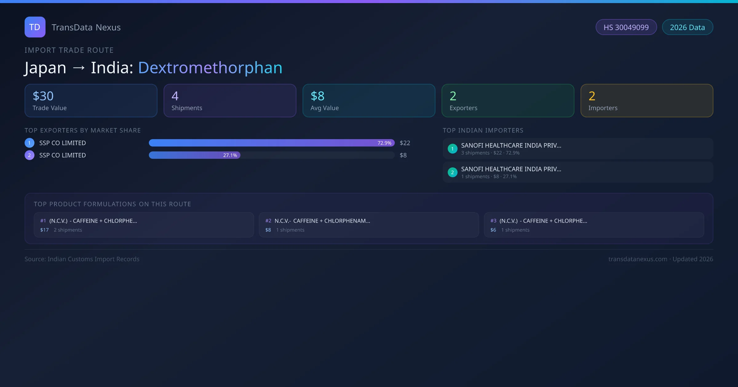 India has recorded 4 verified shipments of Dextromethorphan imported from Japan, representing a combined trade value of $30 USD. This corridor is served by 2 active Japan exporters, with an average shipment value of $8 USD. The leading Japan supplier is SSP CO LIMITED , which accounts for 73% of total import value with 3 shipments worth $22 USD. On the buying side, SANOFI HEALTHCARE INDIA PRIVATE LIMITED is the largest Indian importer with $22 USD in purchases. All data sourced from Indian Customs (DGFT) shipping bill of entry records. Values reported in FOB USD.